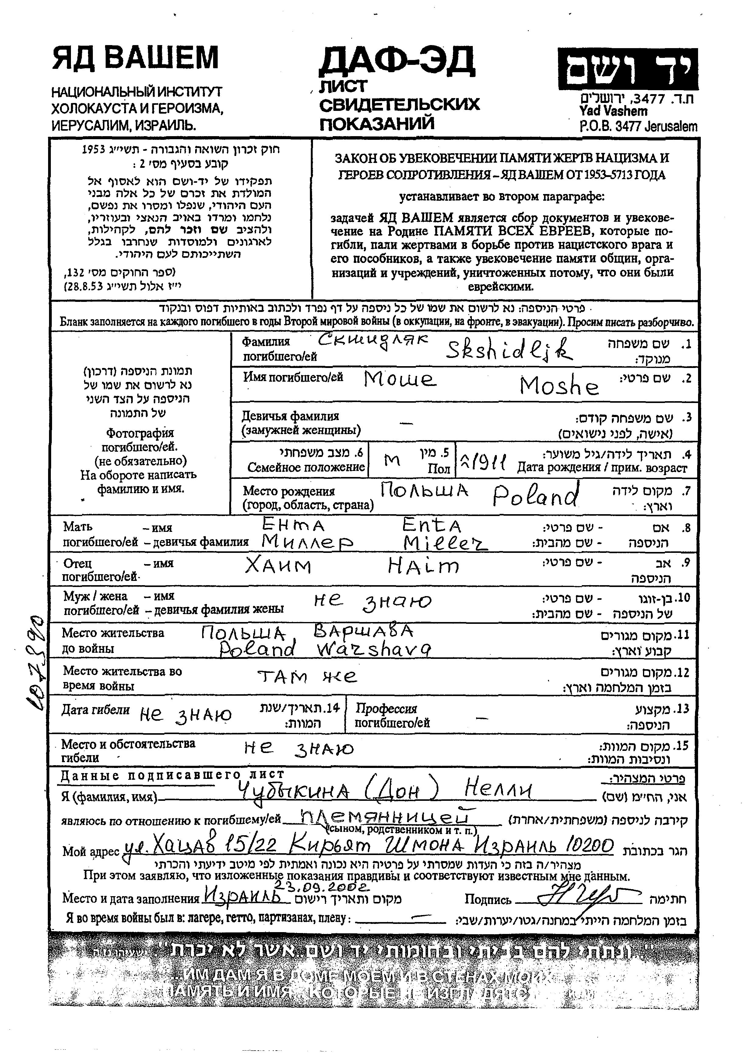 A Skshidlyak est né à Pologne en 1911, fils de Haim et de Enta. Avant la seconde guerre mondiale il vivait à Warszawa, Pologne. Au cours de la guerre, il était à Warszawa, Pologne.