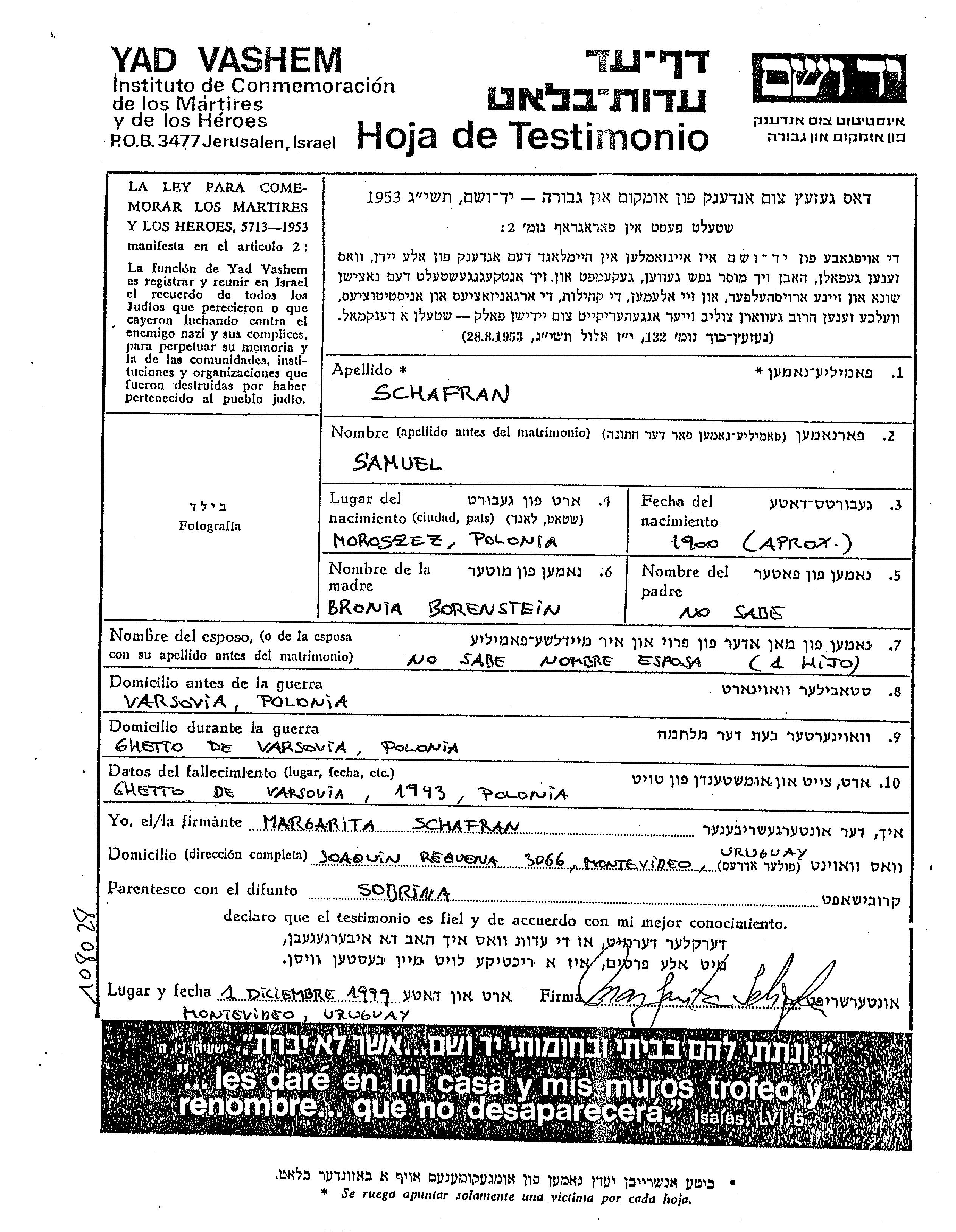 Schafran Samuel 1900 Varsovia, Pologne Feuille de témoignage