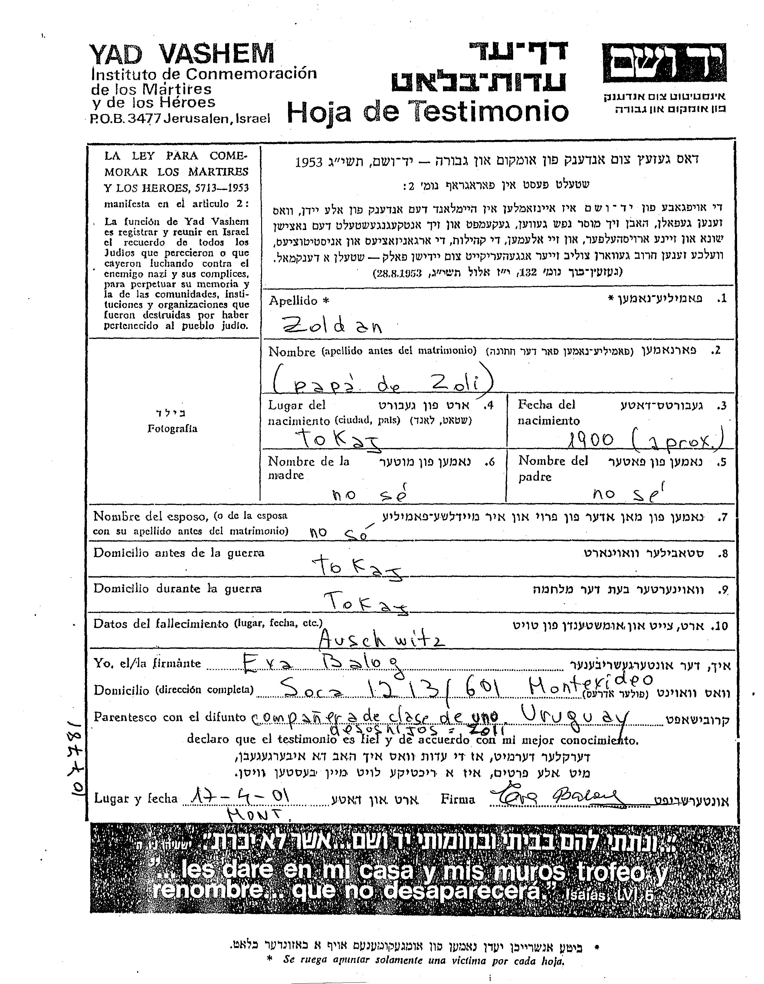 prénom inconnu Zoldan est né à Tokaj, Hongrie en 1900. Avant la seconde guerre mondiale il vivait à Tokaj, Hongrie. Au cours de la guerre, il était à Tokaj, Hongrie.