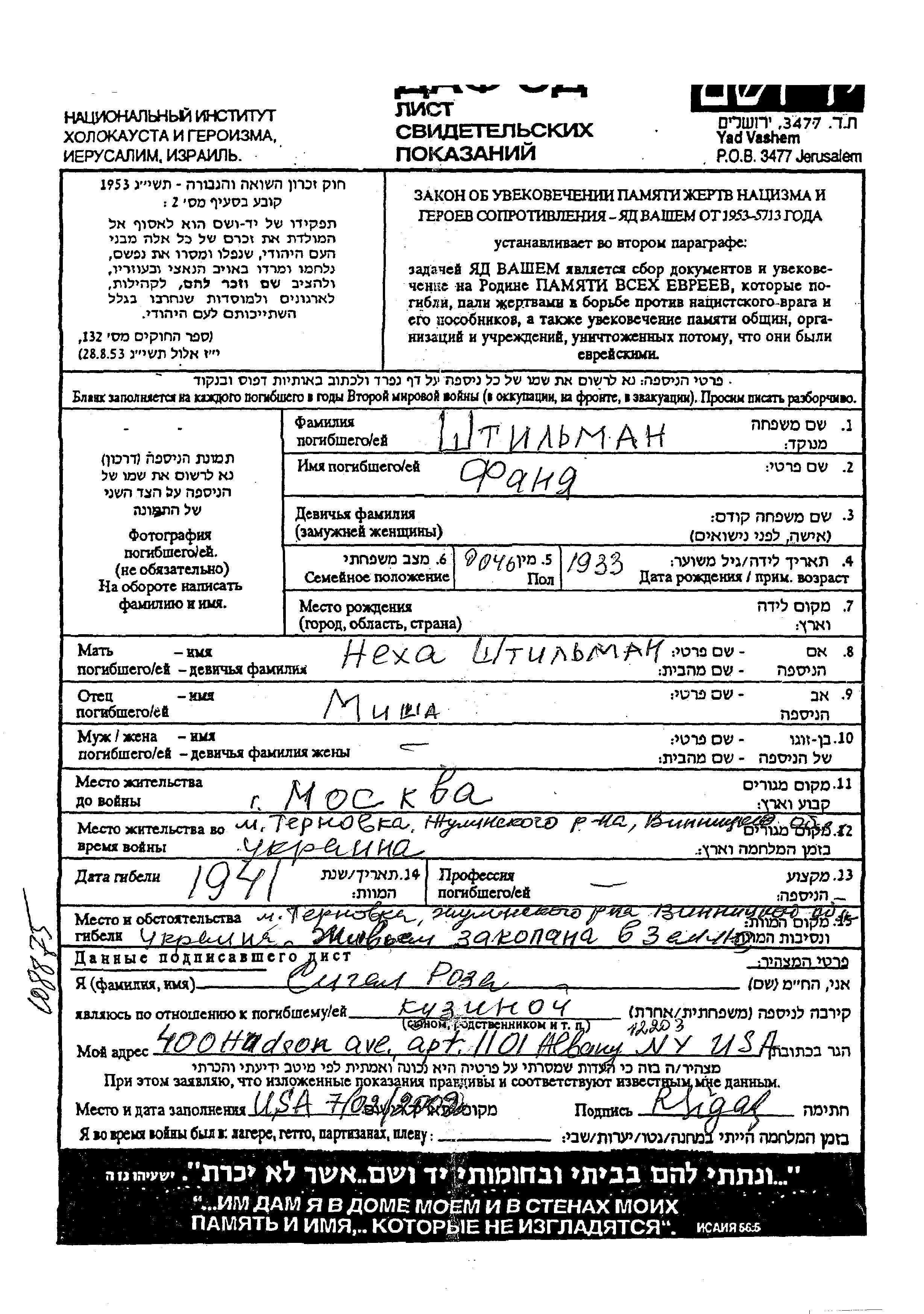 Shtilman Fanya 1933 Moskva, Russie (URSS) Feuille de témoignage