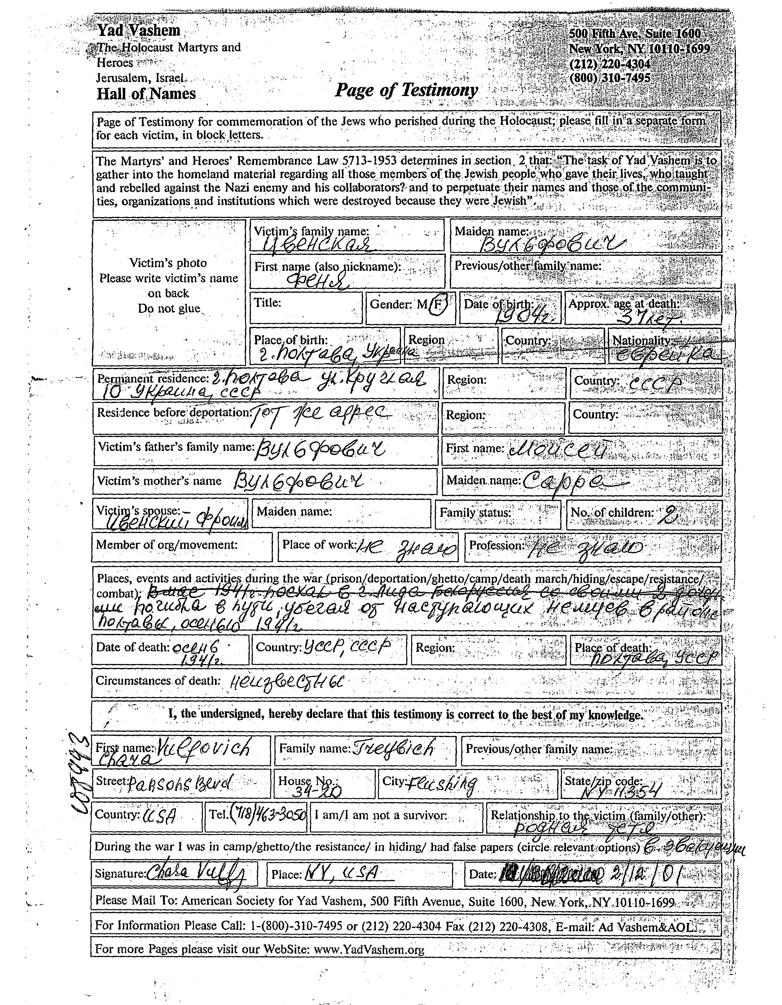 Fenya Ivenskaya née Vulfovich est née à Poltava, Ukraine (URSS) en 1904, fille de Moisei et de Sarra. Elle était Mariée à Froim. Avant la seconde guerre mondiale elle vivait à Poltava, Ukraine (URSS). Pendant la guerre, elle était à Poltava, Ukraine (URSS).