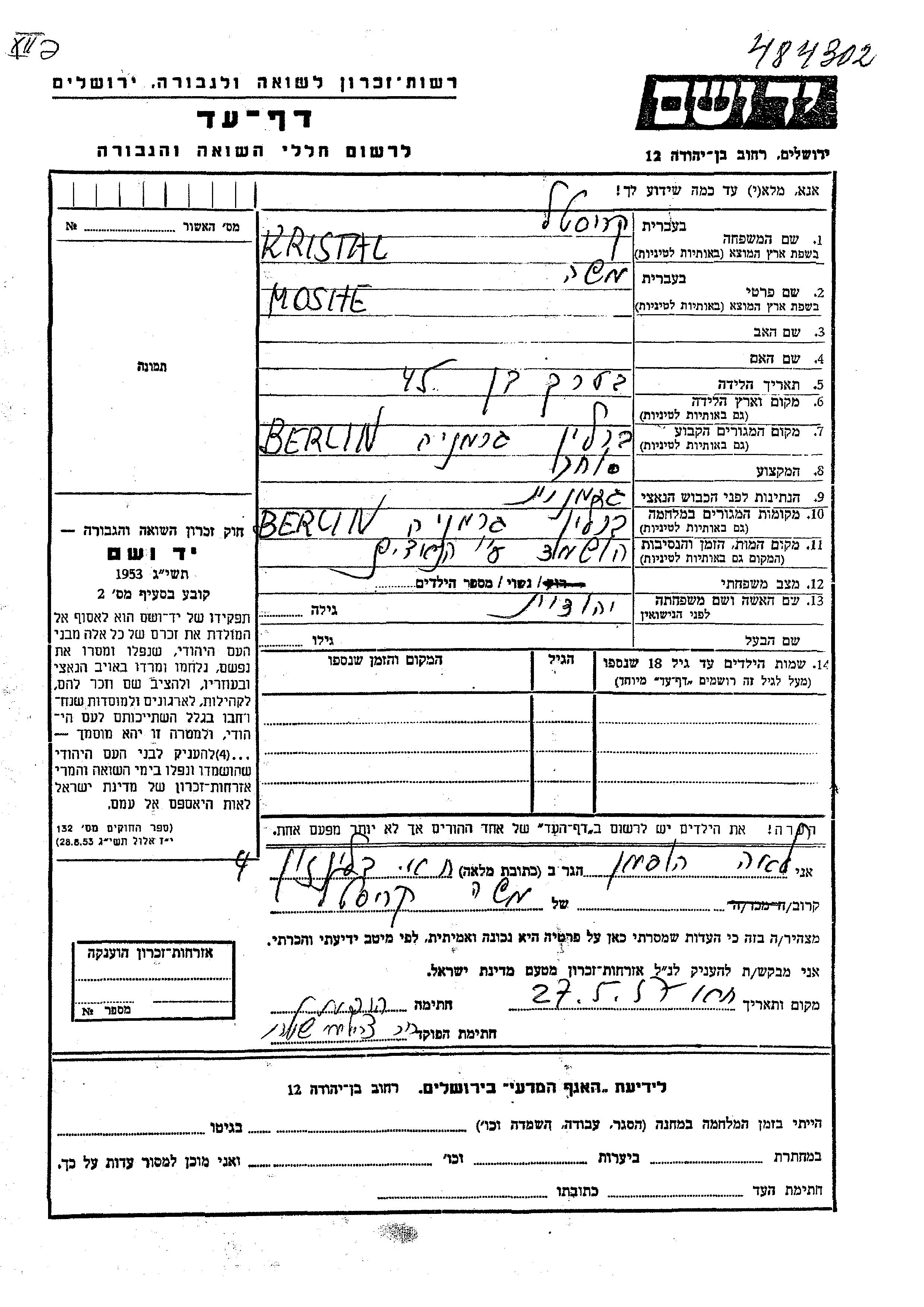 Moshe Kristal. Il était Commerçant/e et Mariée à Yehudit. Avant la seconde guerre mondiale il vivait à Berlin, Allemagne. Au cours de la guerre, il était à Berlin, Allemagne.