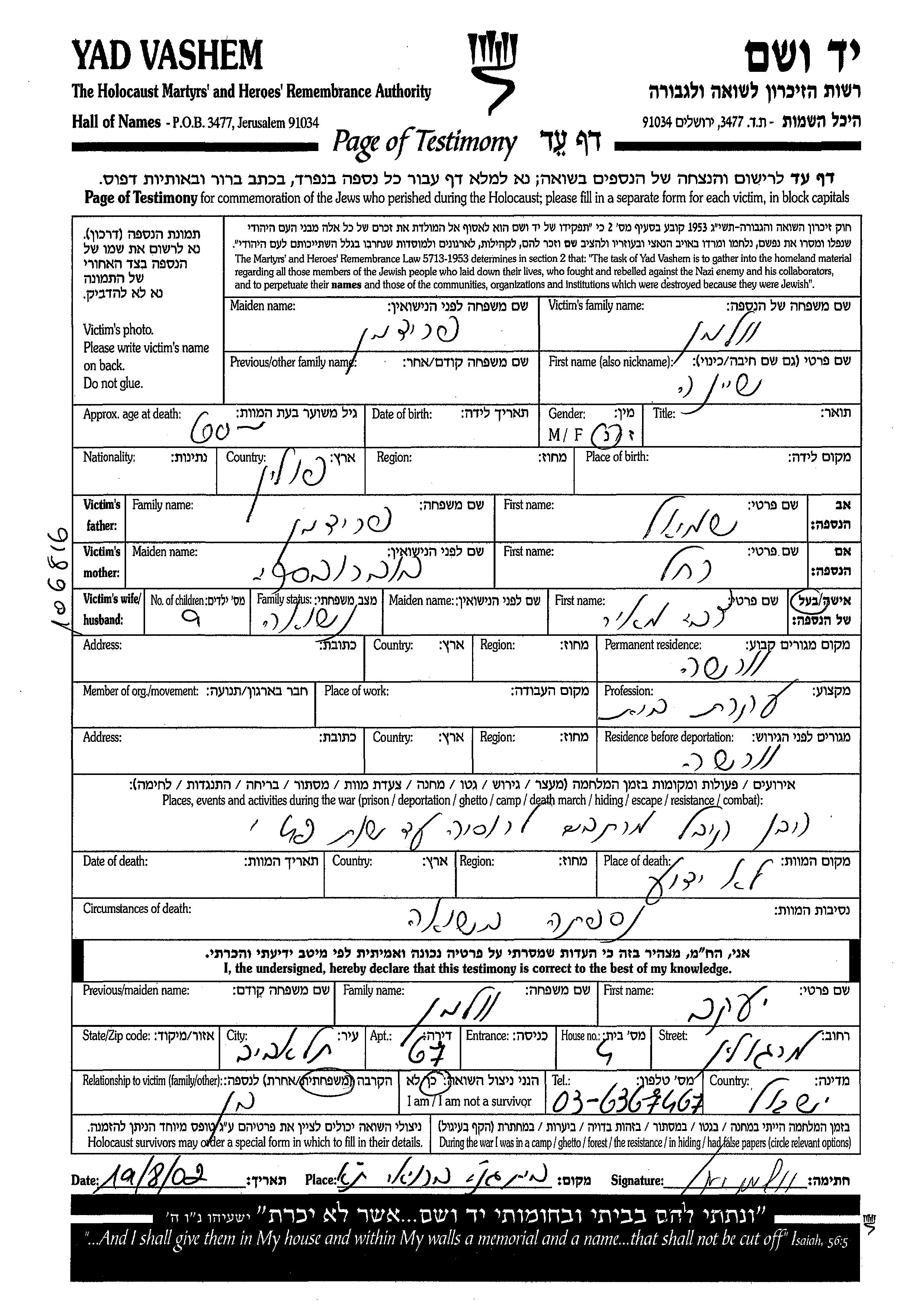 Yad Vashem - Pages of Testimony Names Memorial Collection