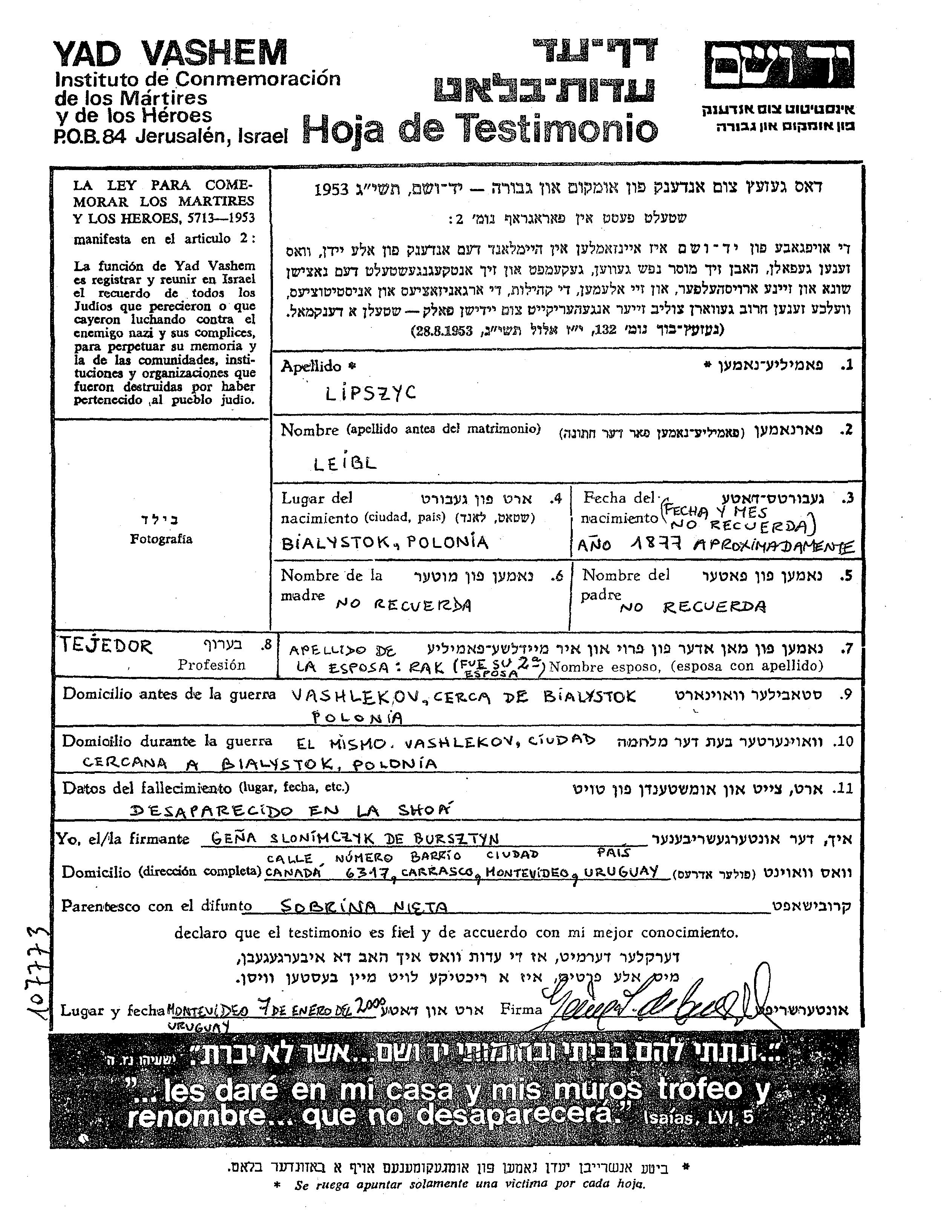 Leibl Lipszyc est né à Bialystok, Pologne en 1877. Il était Tejedor et Marié. Avant la seconde guerre mondiale il vivait à Wasilkow, Pologne. Au cours de la guerre, il était à Wasilkow, Pologne.