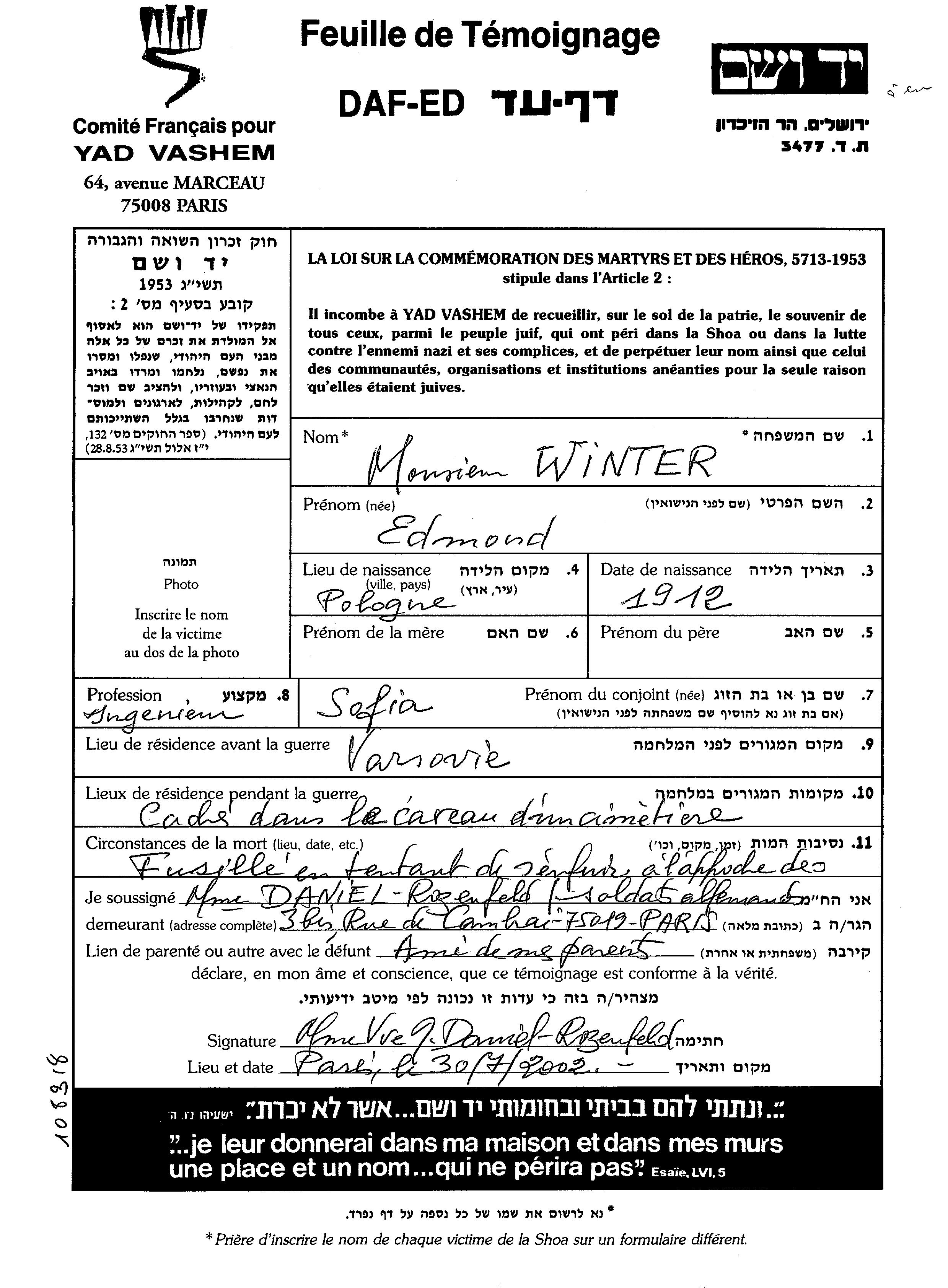 Edmund Winter est né à Pologne en 1912. Il était Ingénieur. Avant la seconde guerre mondiale il vivait à Varsha, Pologne.
