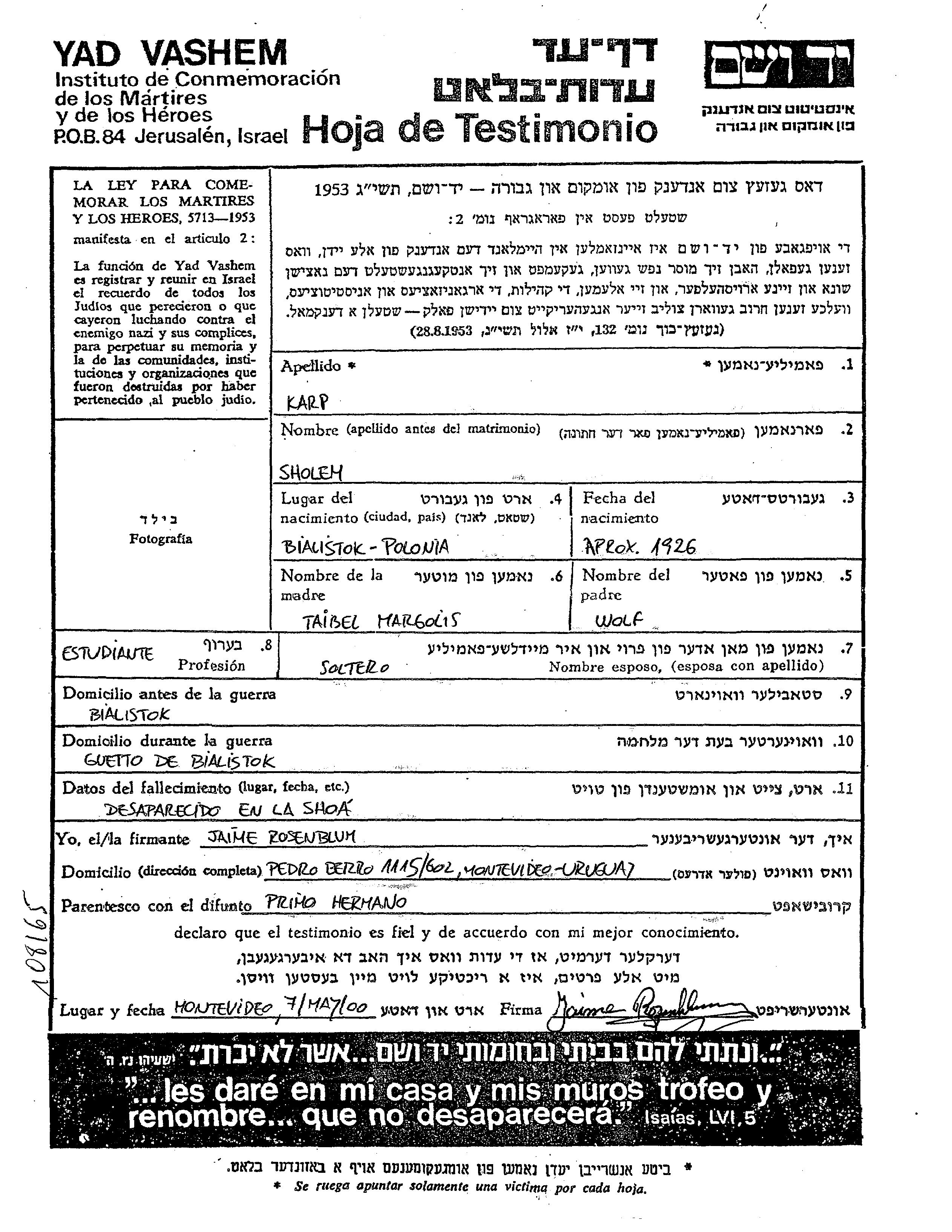 Karp Shalom 1926 Bialystok, Pologne Feuille de témoignage