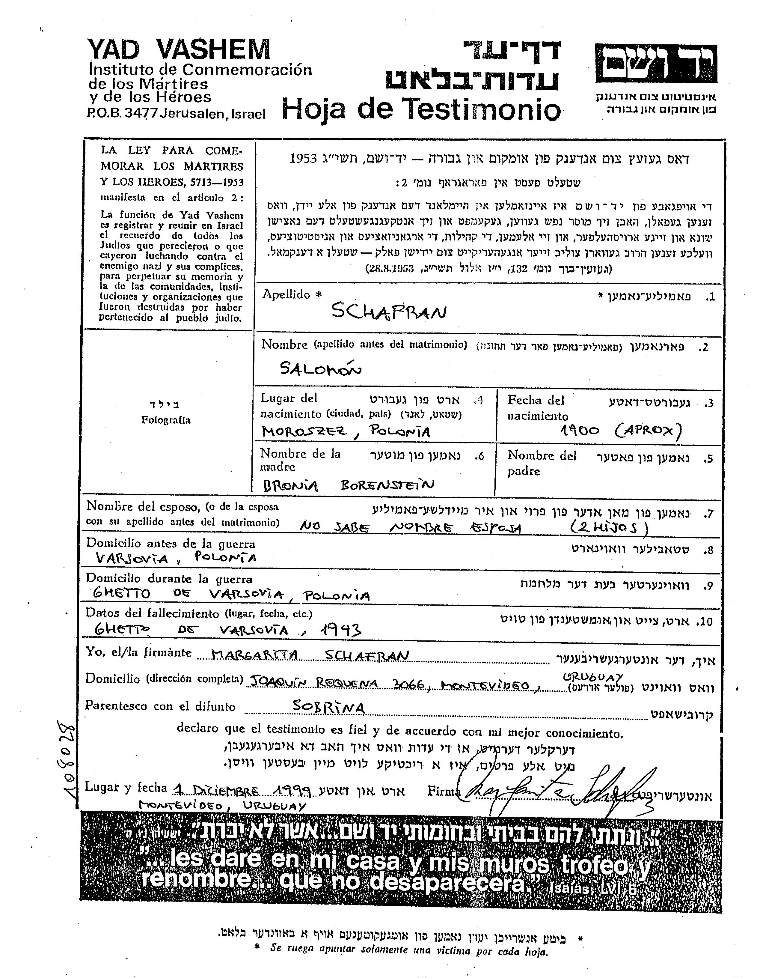Salomon a été assassiné pendant la Shoah. Lieu de la mort: Warszawa, Pologne en 1943.