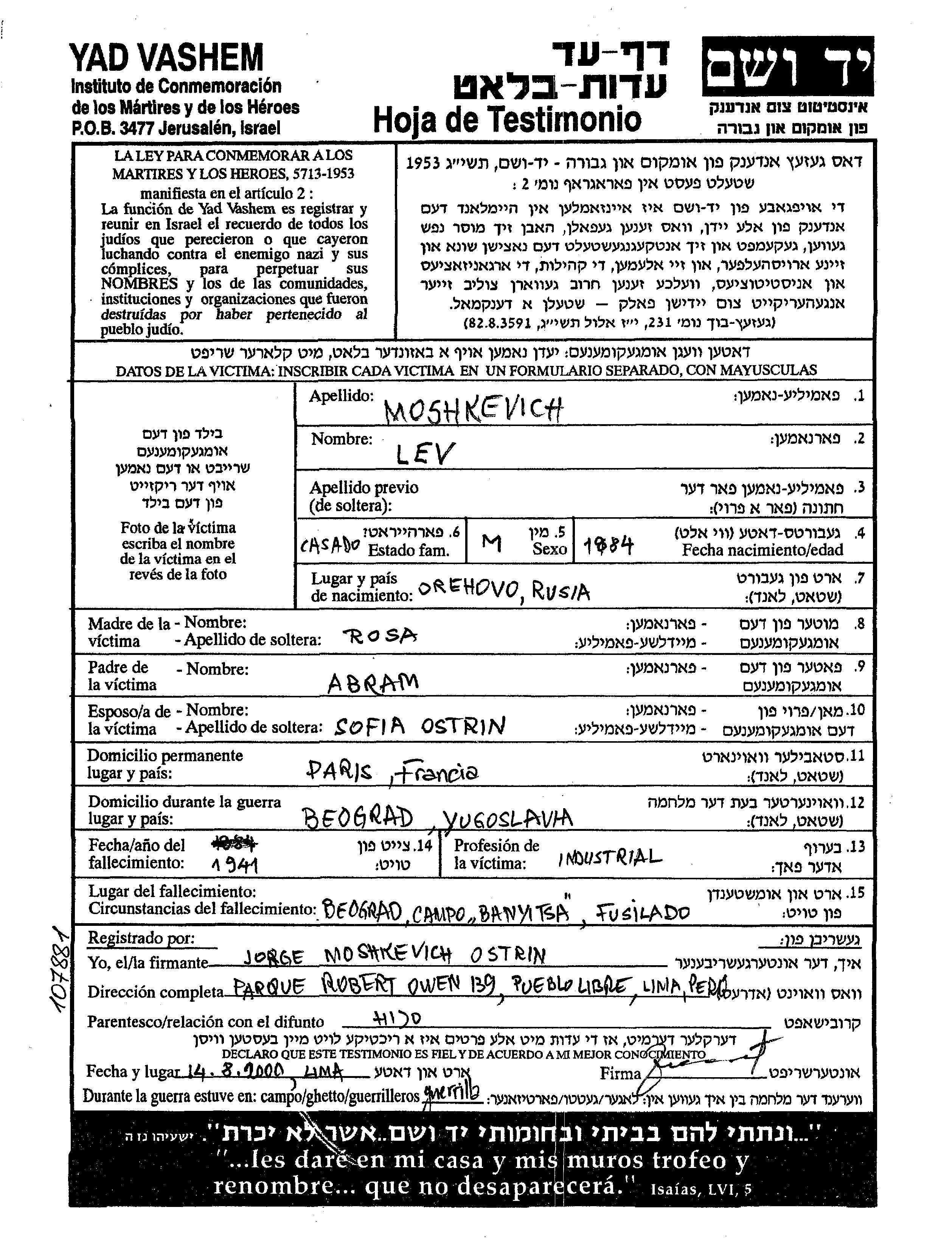 Lev Moshkevich est né à Orekhov, Ukraine (URSS) en 1884, fils de Abram et de Rosa. Il était Industriel et Mariée à Sofia. Avant la seconde guerre mondiale il vivait à Paris, France. Au cours de la guerre, il était à Beograd, Yugoslavie.