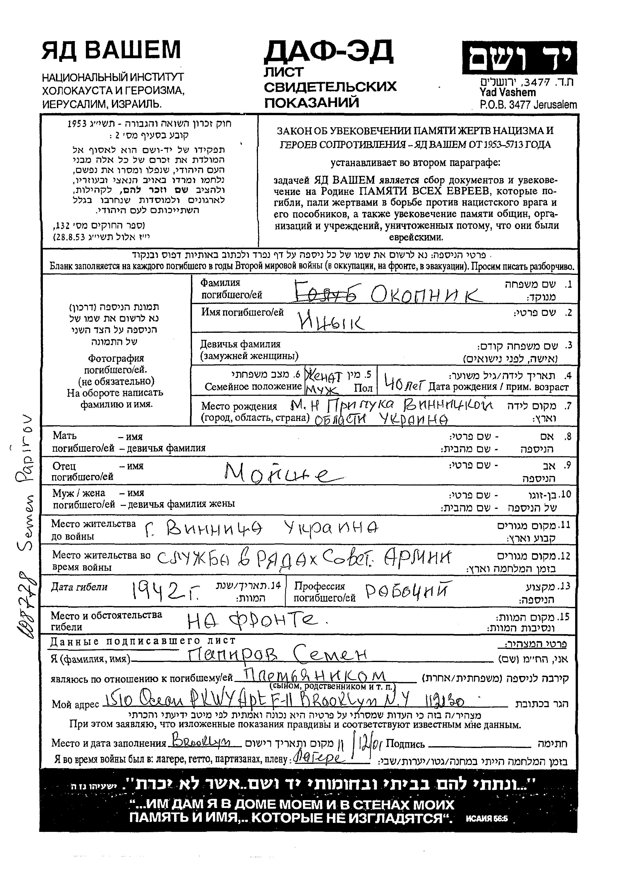 Itzyk Okopnik est né à Priluki, Ukraine (URSS), fils de Moishe. Il était Ouvrier/e et Marié. Avant la seconde guerre mondiale il vivait à Vinnitsa, Ukraine (URSS). Au cours de la guerre, il était à the Soviet armed forces.