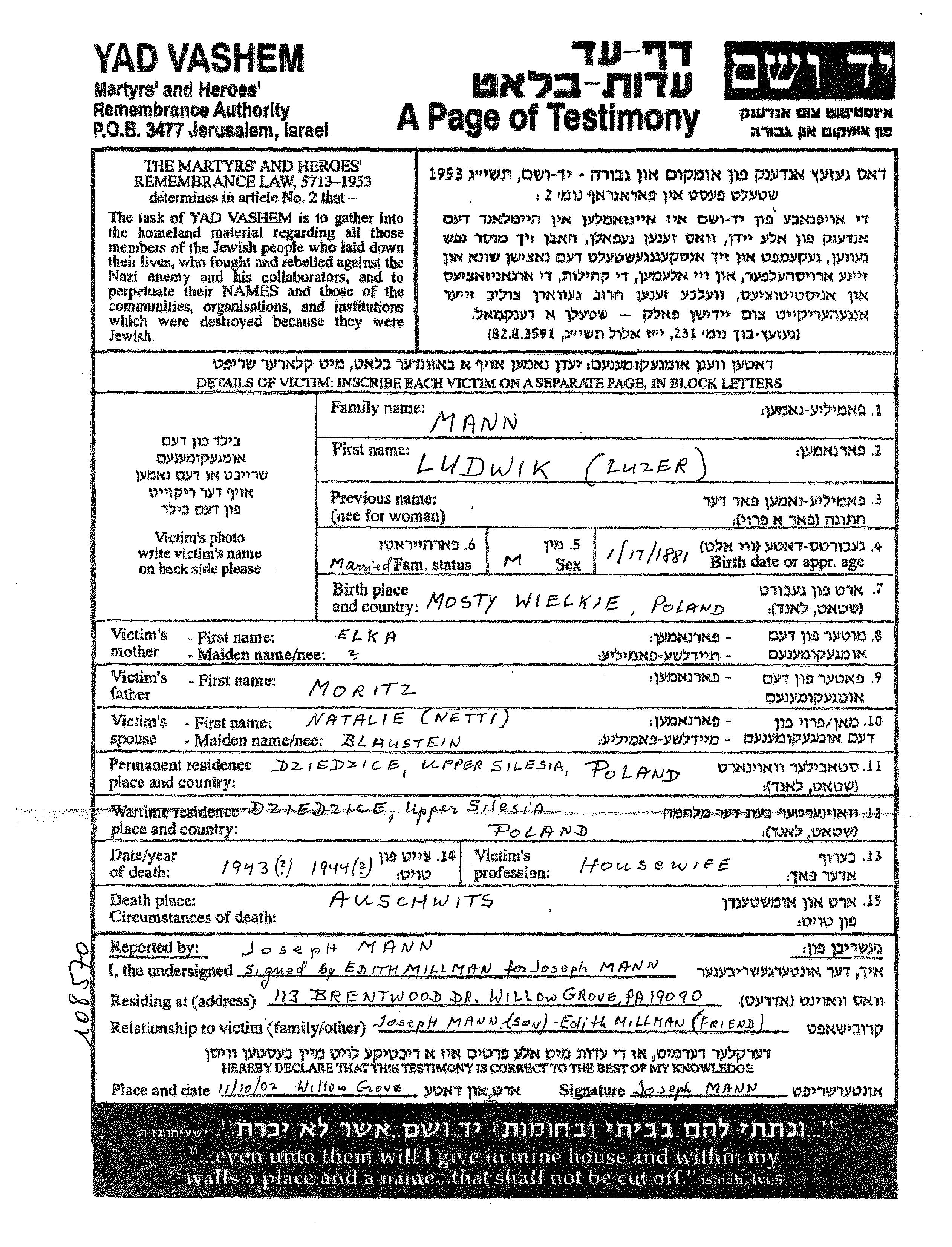 Mann Ludwik Luzer 1881 Dziedzice, Pologne Feuille de témoignage