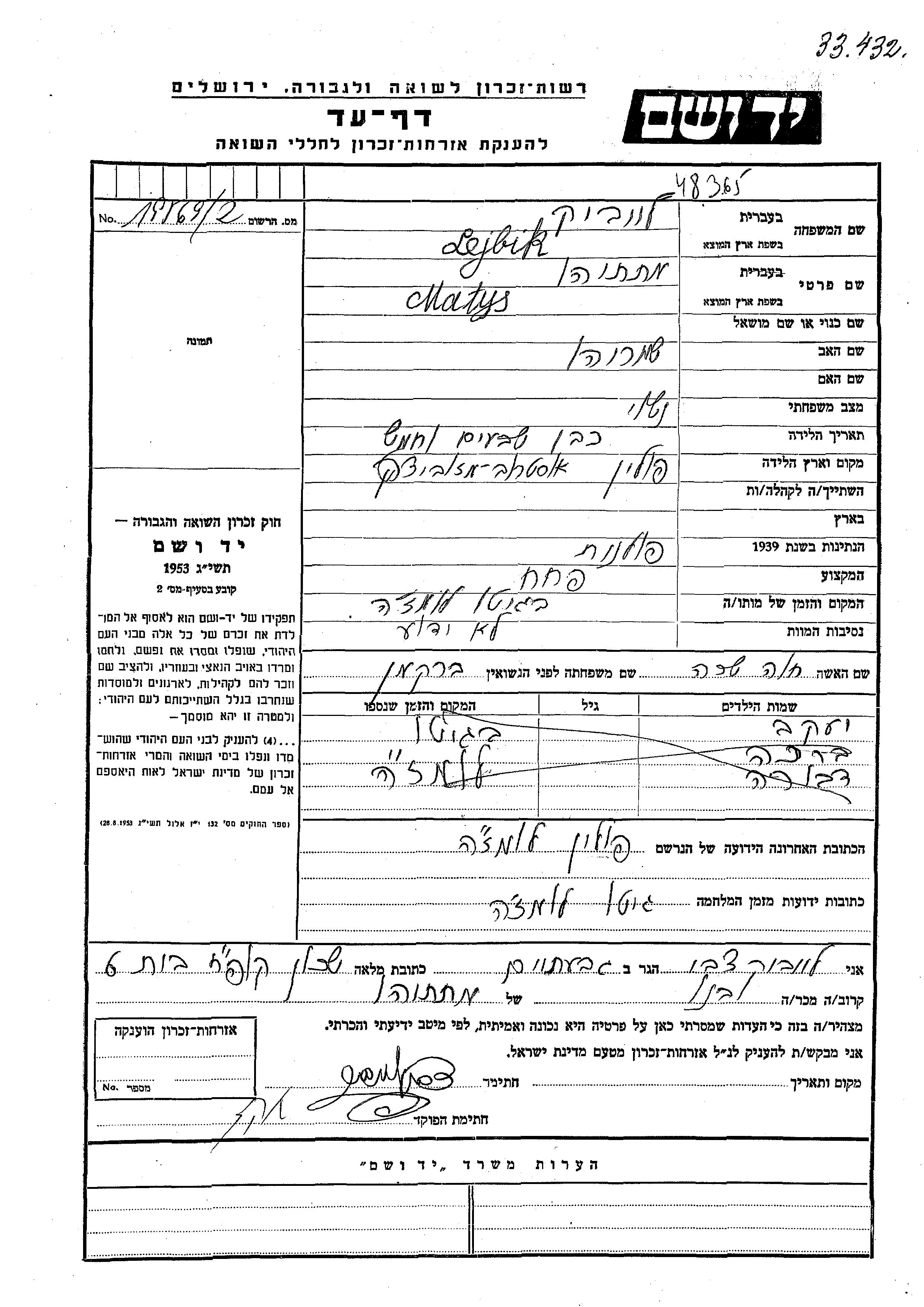 Lejbik Matys Matatiahu endroit inconnu, Feuille de témoignage