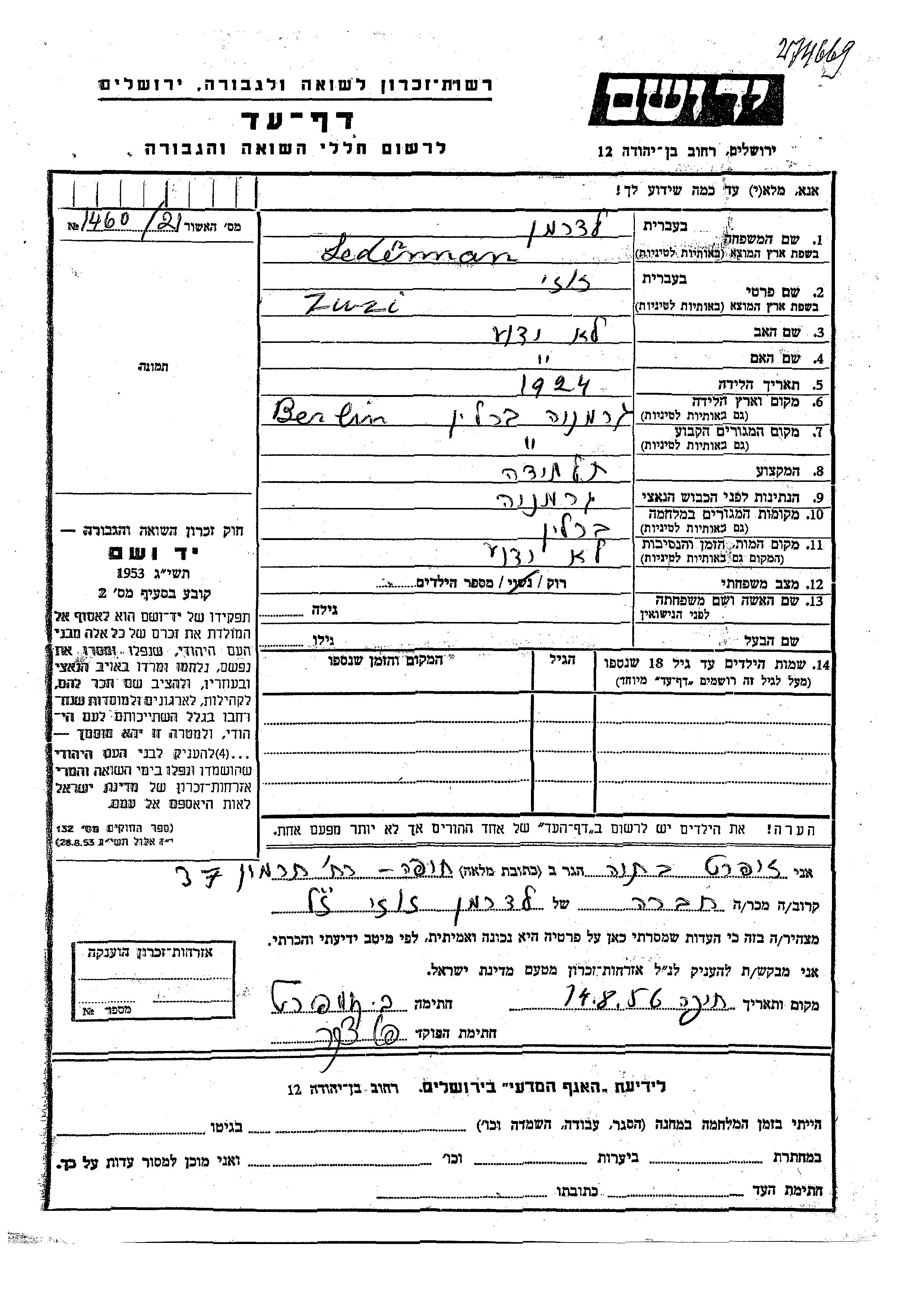 Lederman Zuzi 1924 Berlin, Allemagne Feuille de témoignage