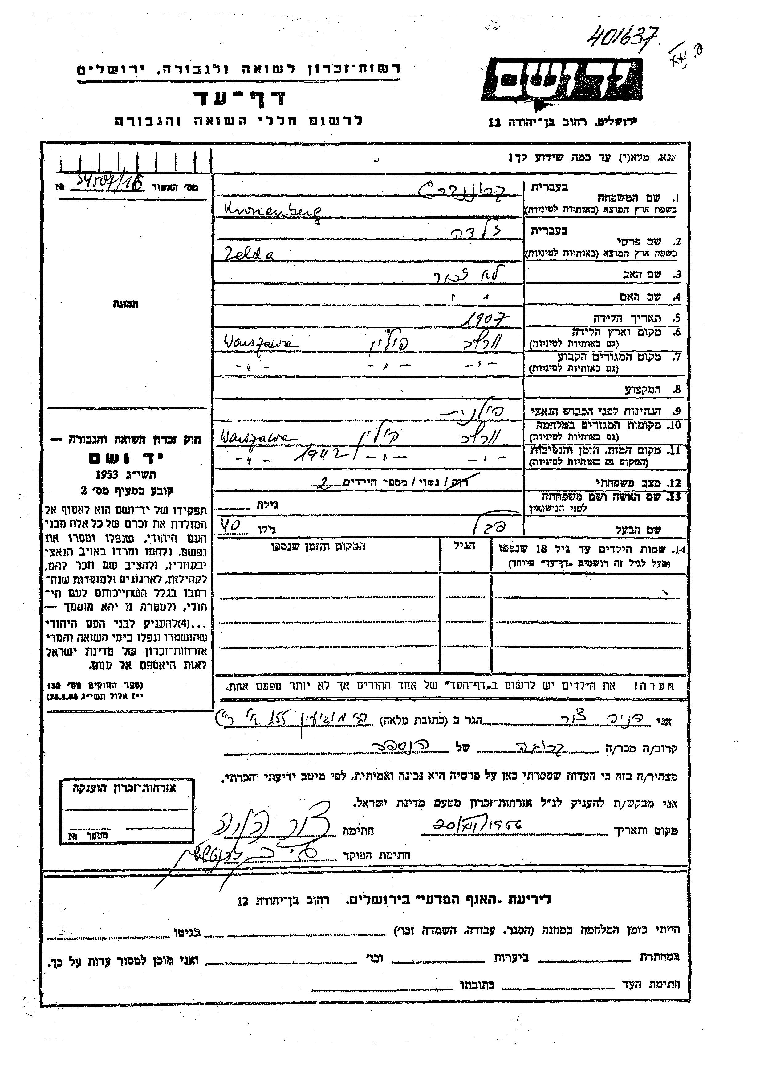 Zelda Kronenberg est née à Warsaw, Pologne en 1907. Elle était Mariée à Pavel. Avant la seconde guerre mondiale elle vivait à Warsaw, Pologne. Pendant la guerre, elle était à Warsaw, Pologne.