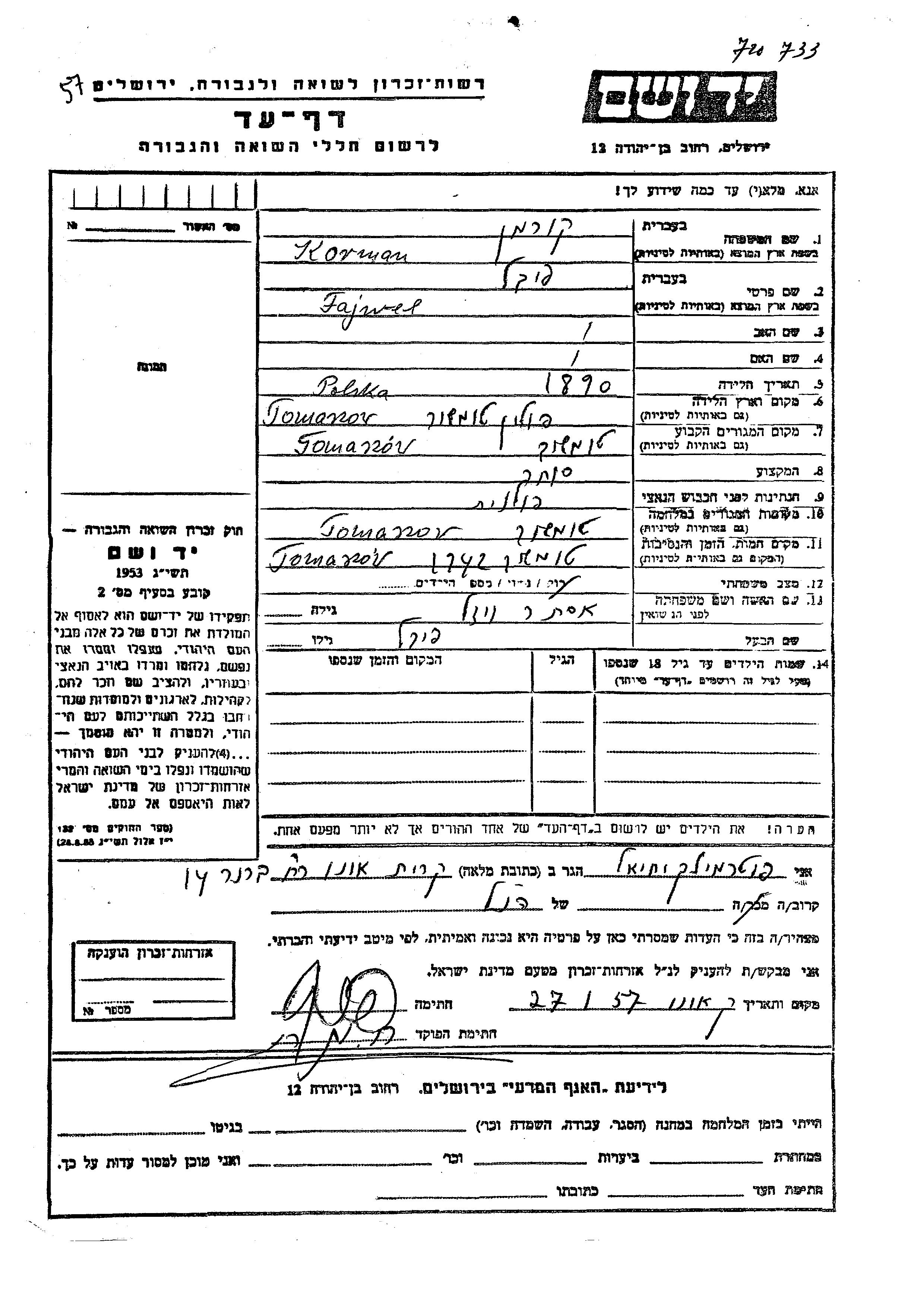 Korman Fajwel 1890 Tomaszow, Pologne Feuille de témoignage