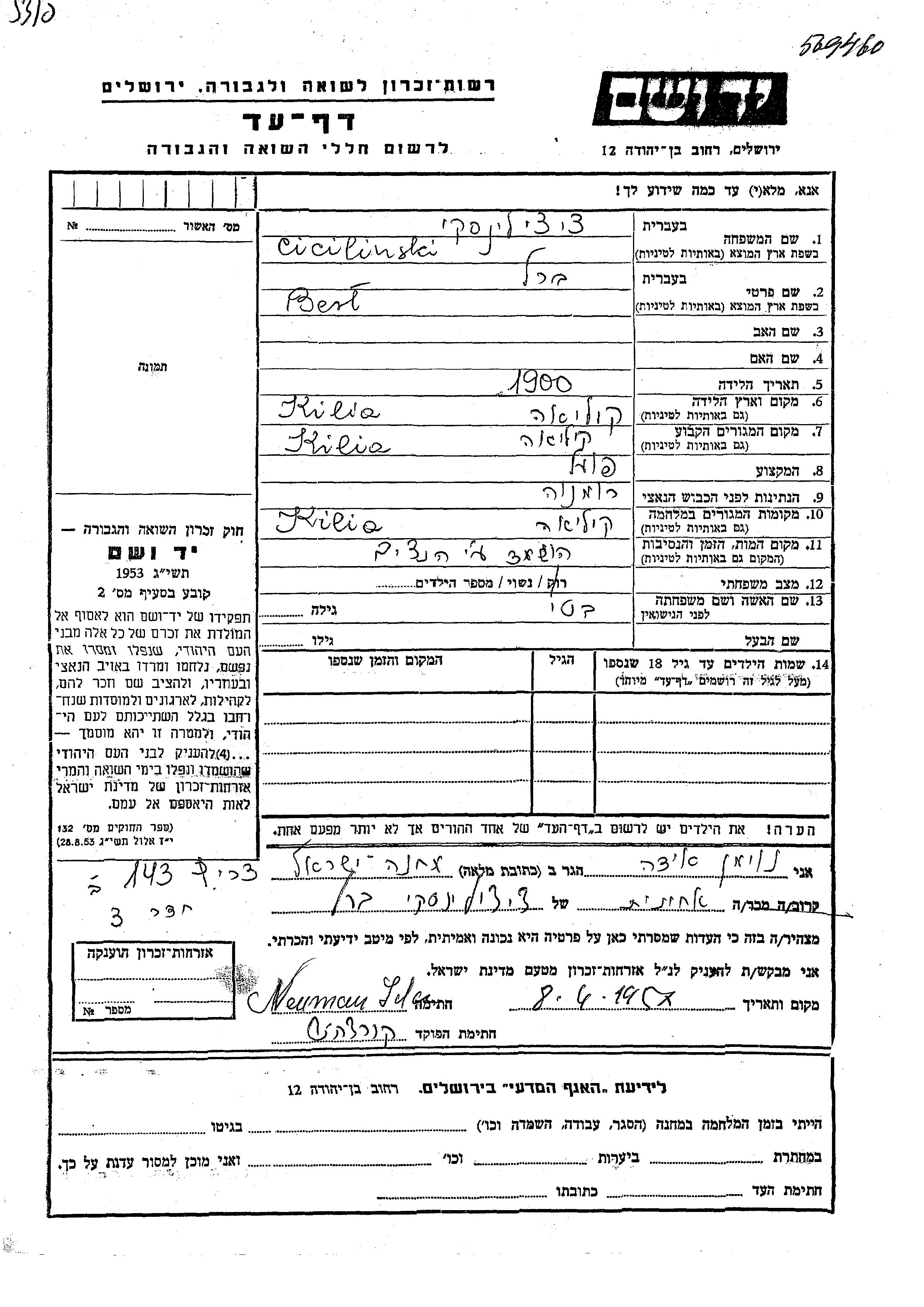Berl Cicilinski est né à Kilia, Roumanie en 1900. Il était Ouvrier/e et Mariée à Beti. Avant la seconde guerre mondiale il vivait à Kilia, Roumanie. Au cours de la guerre, il était à Kilia, Roumanie.