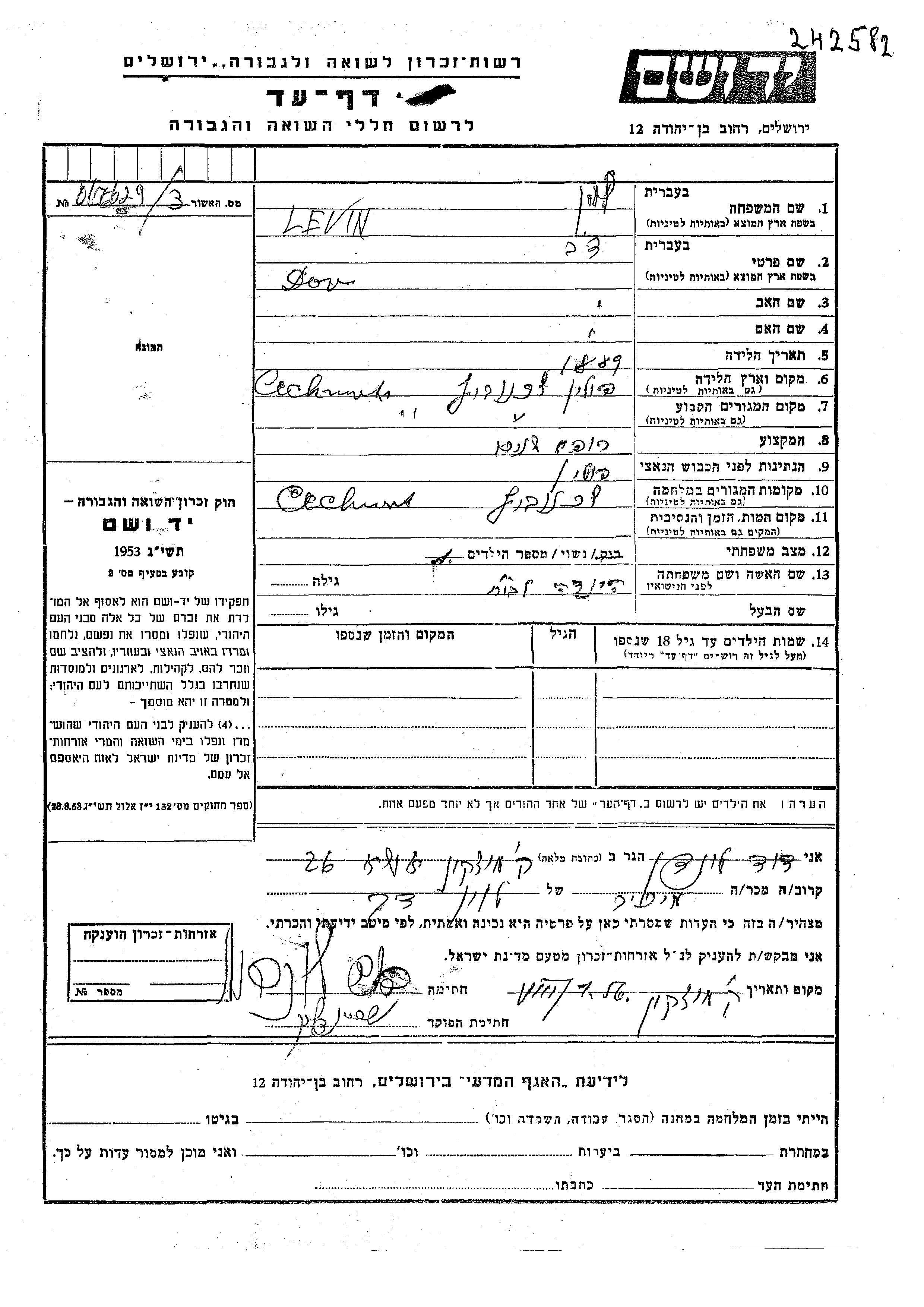 Levin Dov 1889 Cechnow, Pologne Feuille de témoignage