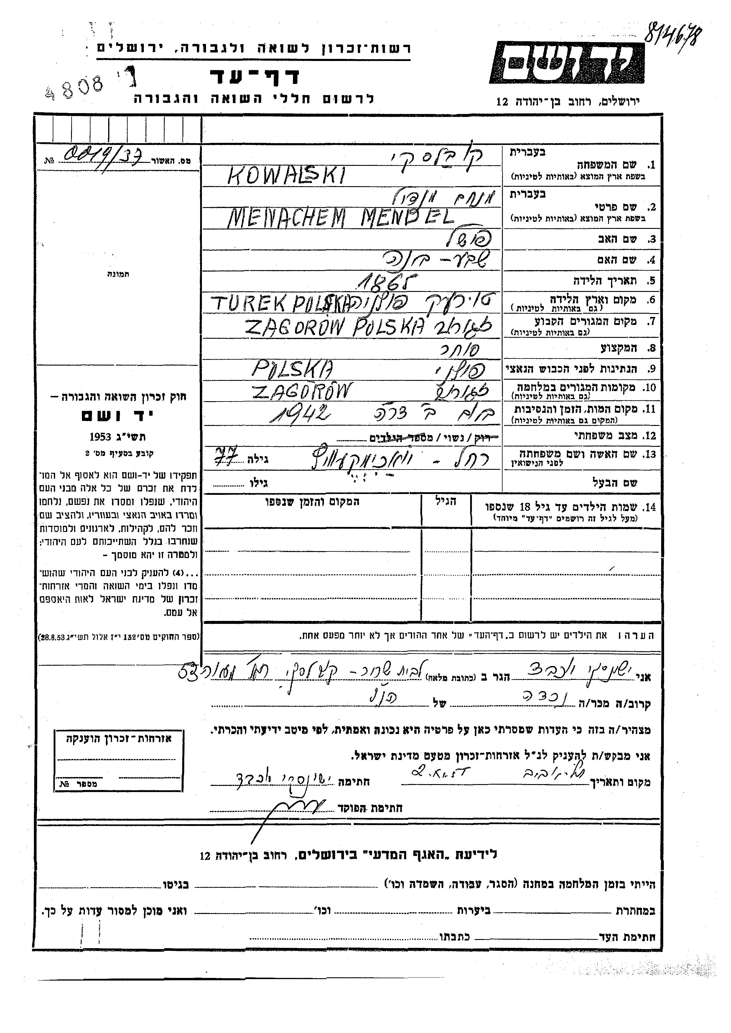 Kowalski Menachem Mendel 1865 Zagorow, Pologne Feuille de témoignage