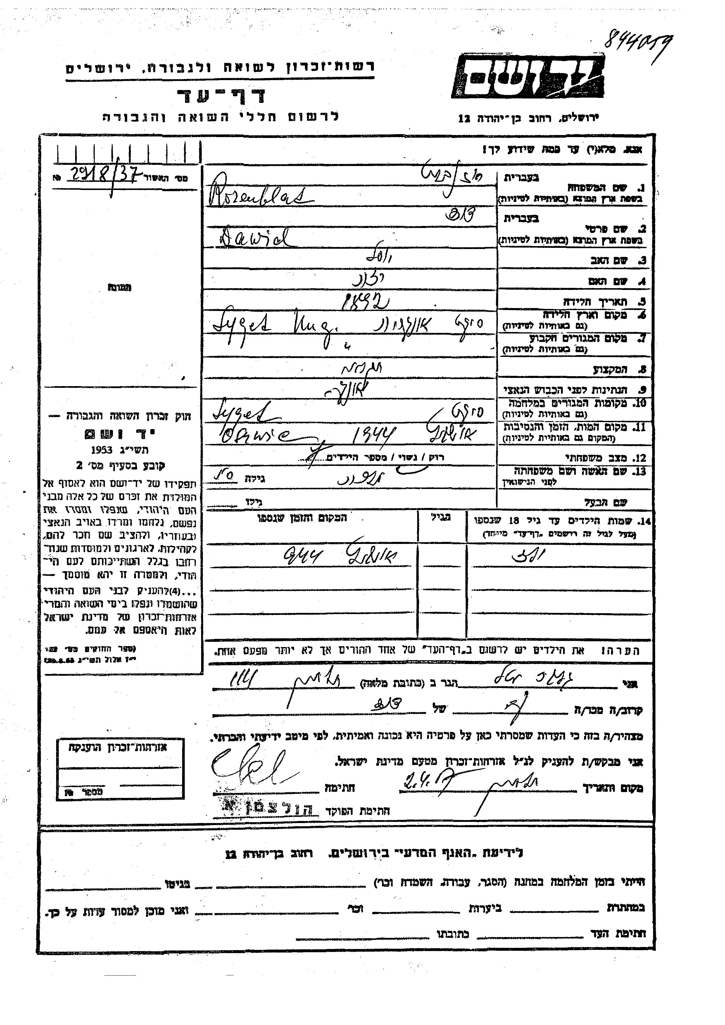 Rosenblat Dawid 1892 Syget, Roumanie Feuille de témoignage