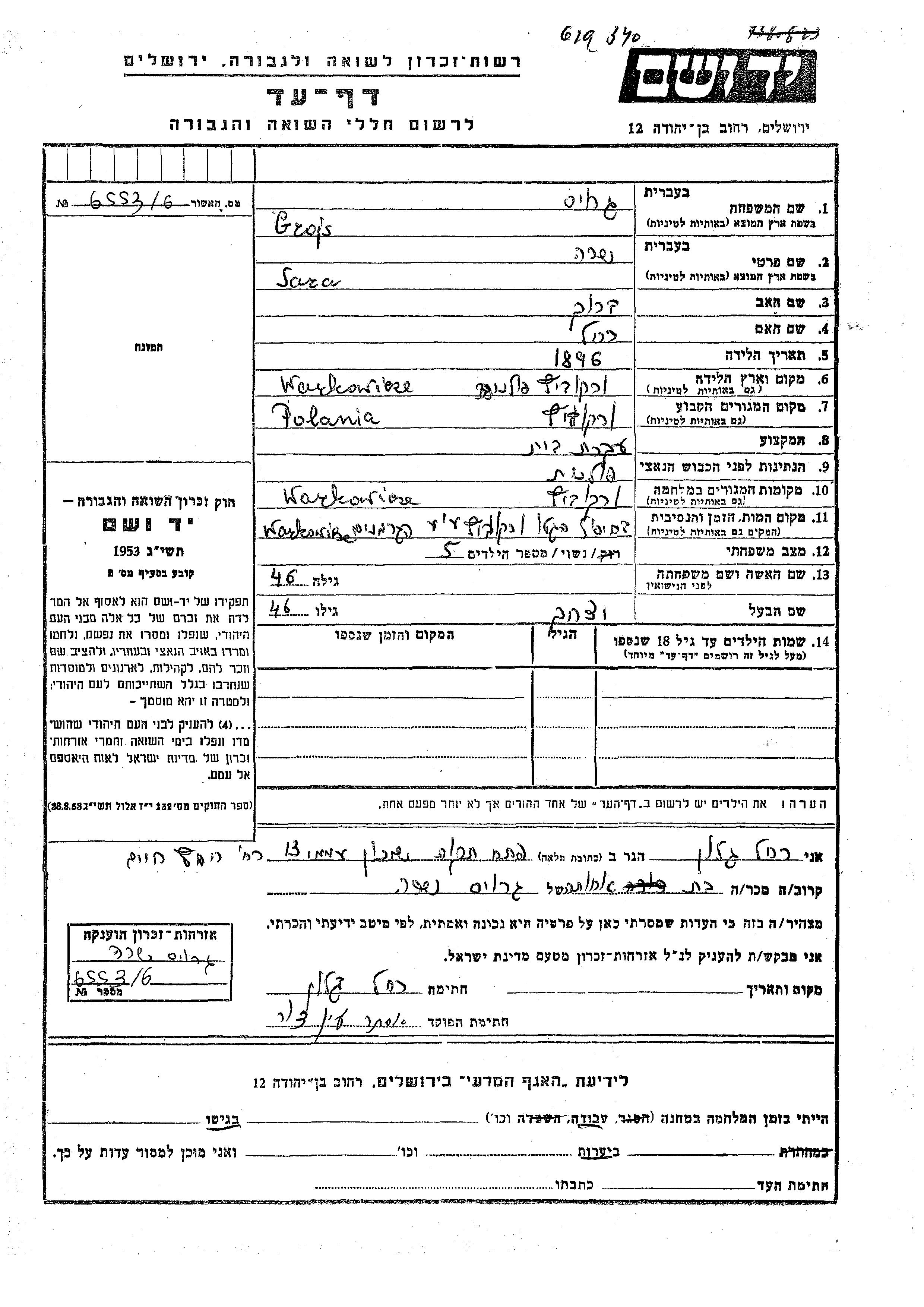 Grois Sara 1896 Warkowicze, Pologne Feuille de témoignage