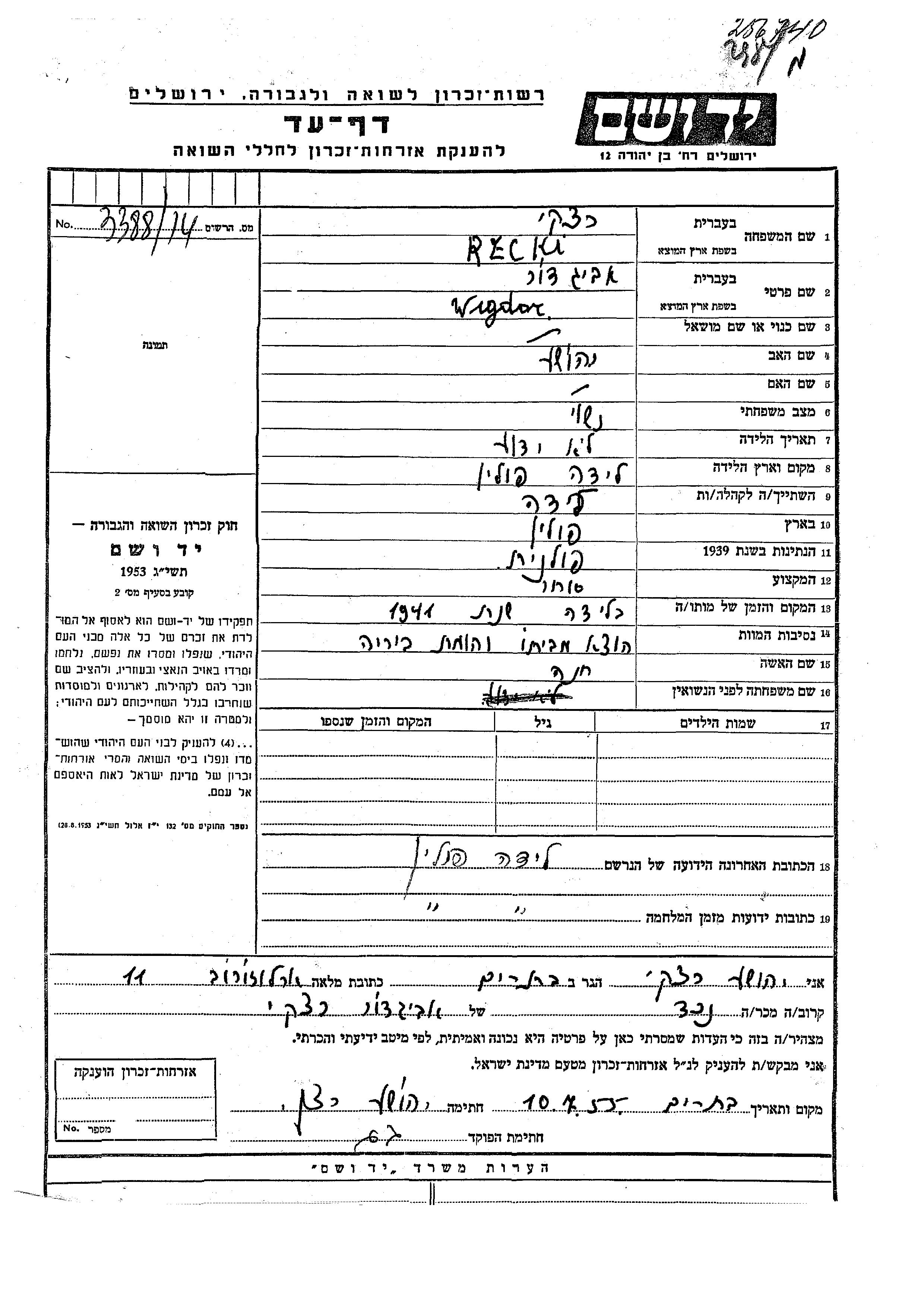 Wigdor a été assassiné pendant la Shoah. Lieu de la mort: Lida, Pologne en 1941.
