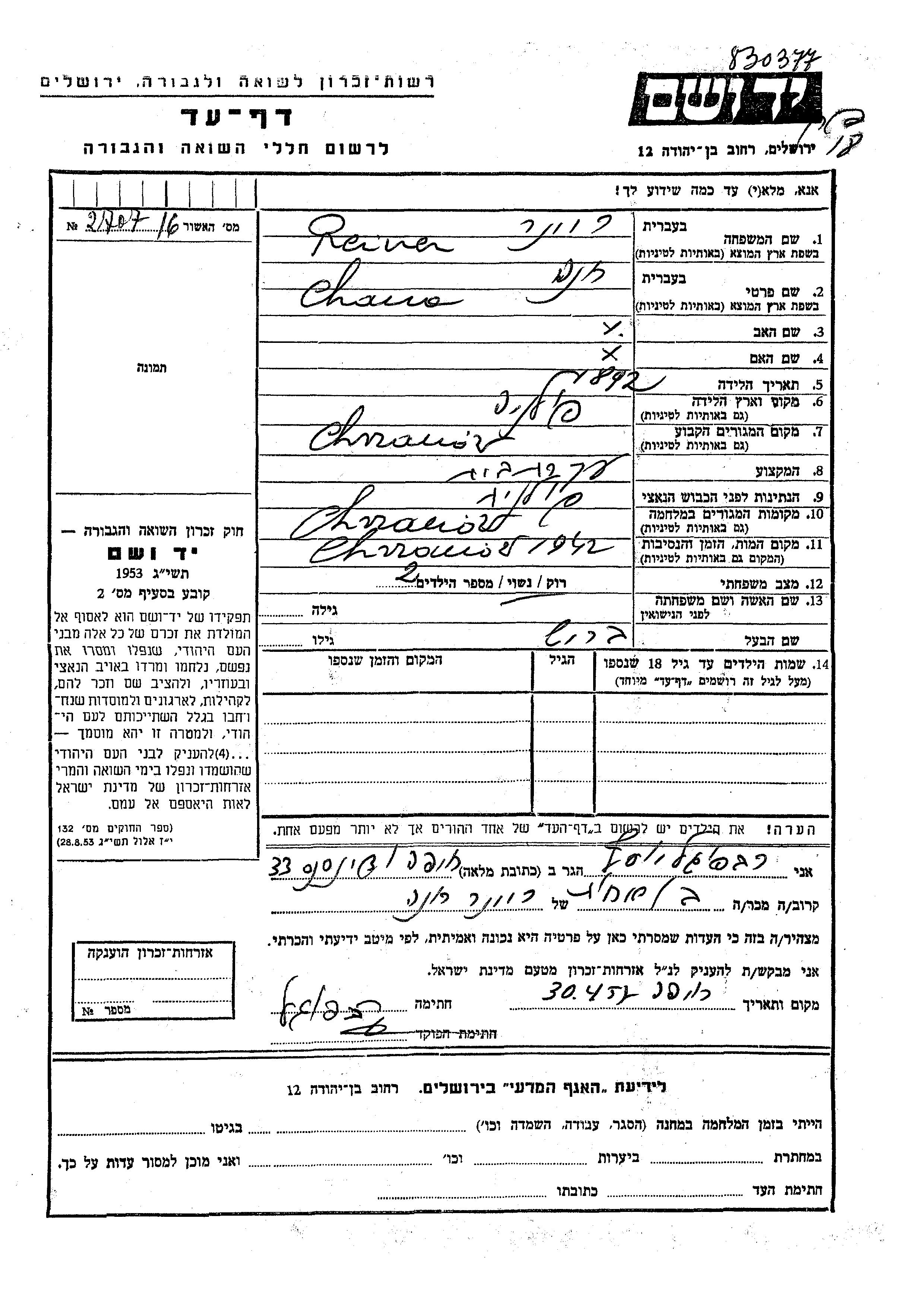 Reiner Chana 1892 Chrzanow, Pologne Feuille de témoignage