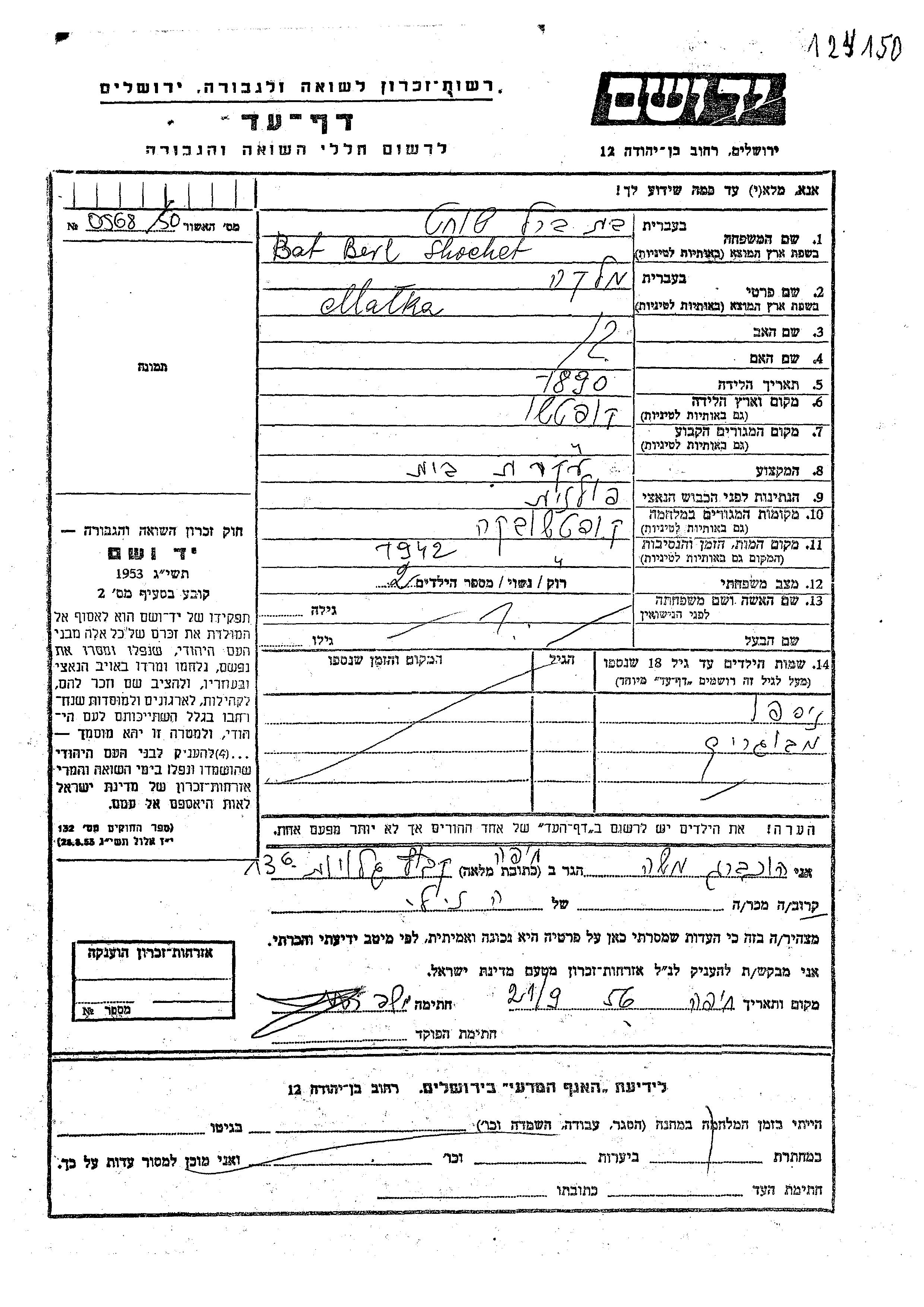 Malka Berl Bet Bat est née à Kopaczowka, Pologne en 1890. Elle était Femme au foyer et Mariée. Avant la seconde guerre mondiale elle vivait à Kopaczowka, Pologne. Pendant la guerre, elle était à Kopaczowka, Pologne.