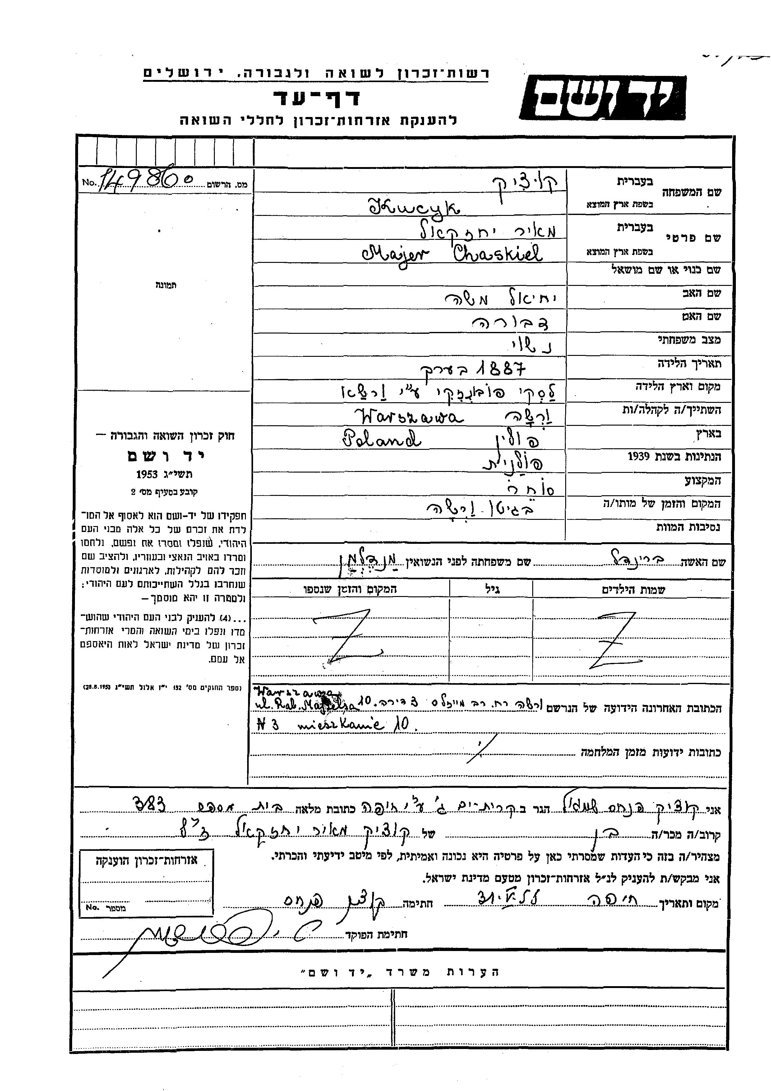 Kucyk Majer Chaskiel 1887 Warszawa, Pologne Feuille de témoignage