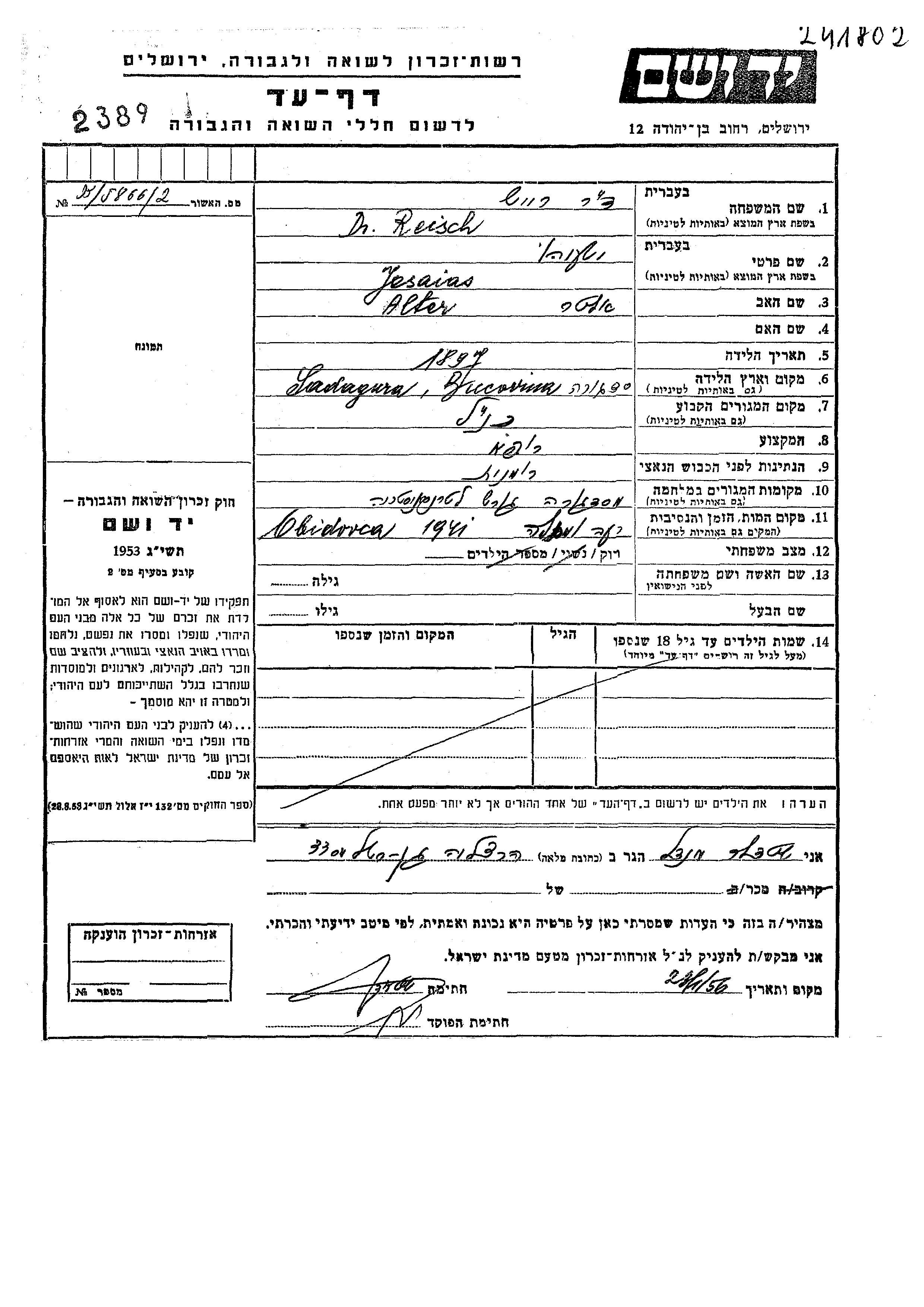 Dr. Jesaias Reisch est né à Sadagura, Roumanie en 1897, fils de Alter. Il était Médecin et Célibataire. Avant la seconde guerre mondiale il vivait à Sadagura, Roumanie. Au cours de la guerre, il était à Transnistria, Ukraine (URSS).