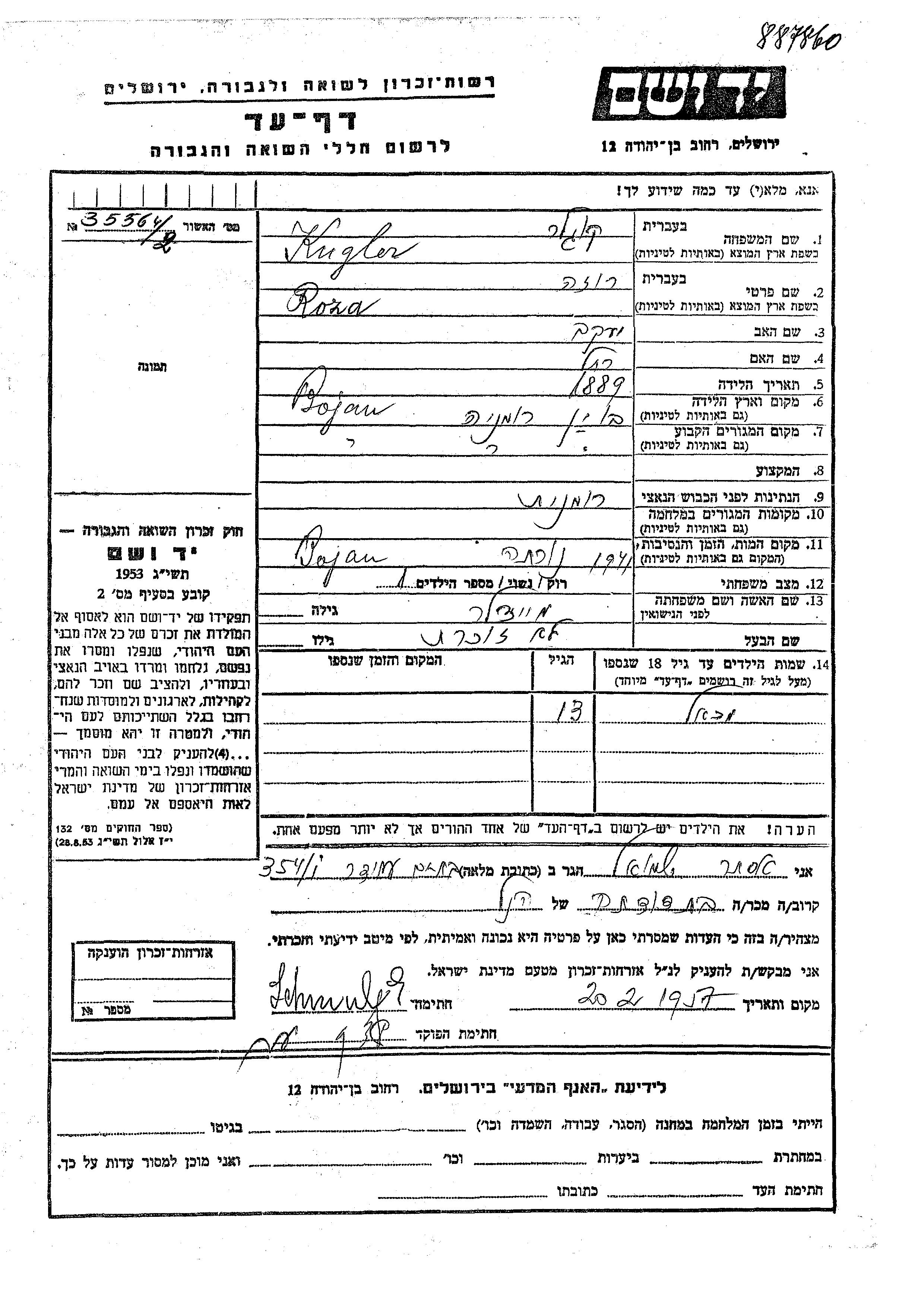 Roza Kugler née Meidler est née à Bojan, Roumanie en 1889, fille de Yaakov et de Rakhel. Elle était Mariée. Avant la seconde guerre mondiale elle vivait à Bojan, Roumanie.