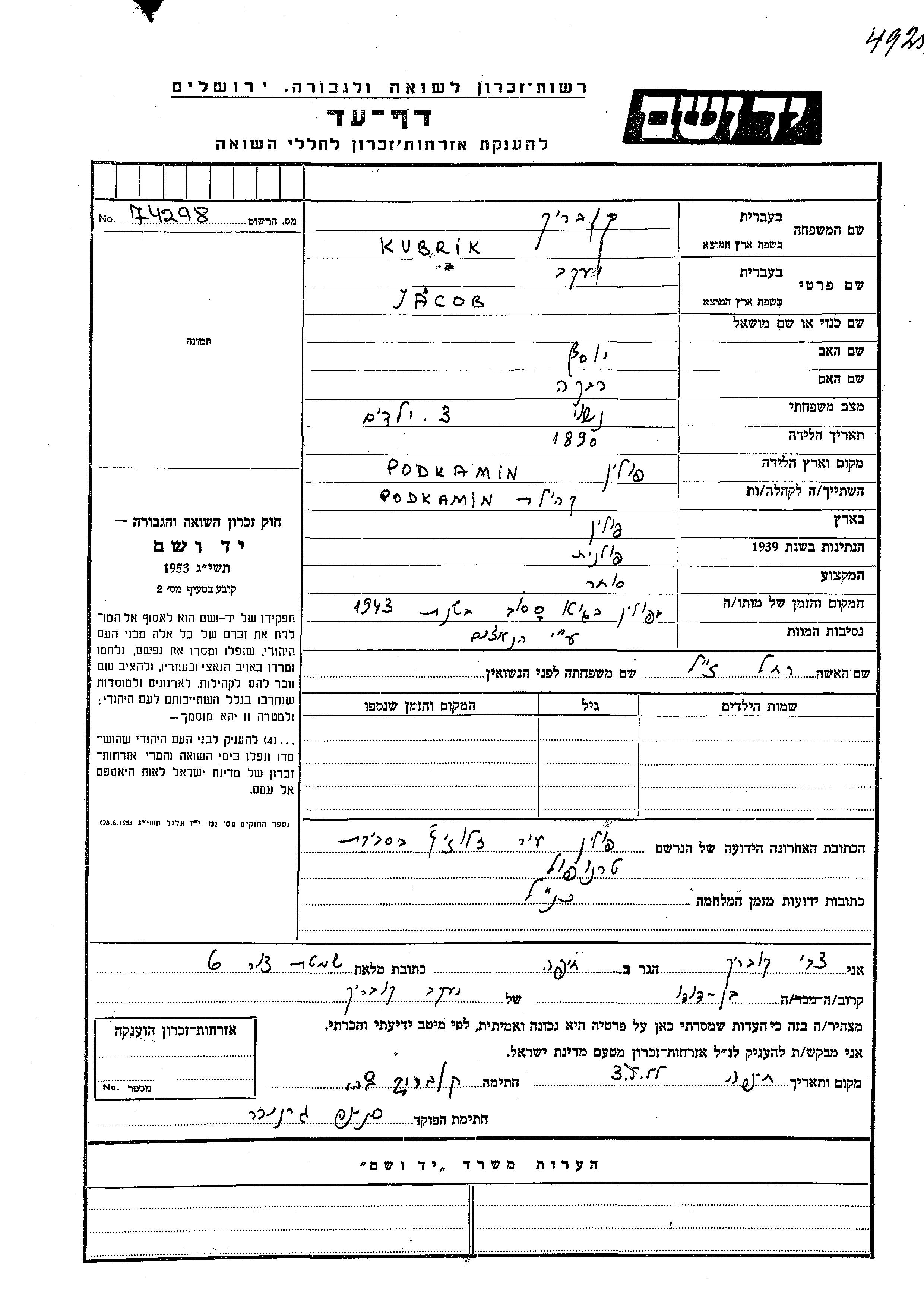 Kubrik Jacob 1890 Podkamien, Pologne Feuille de témoignage