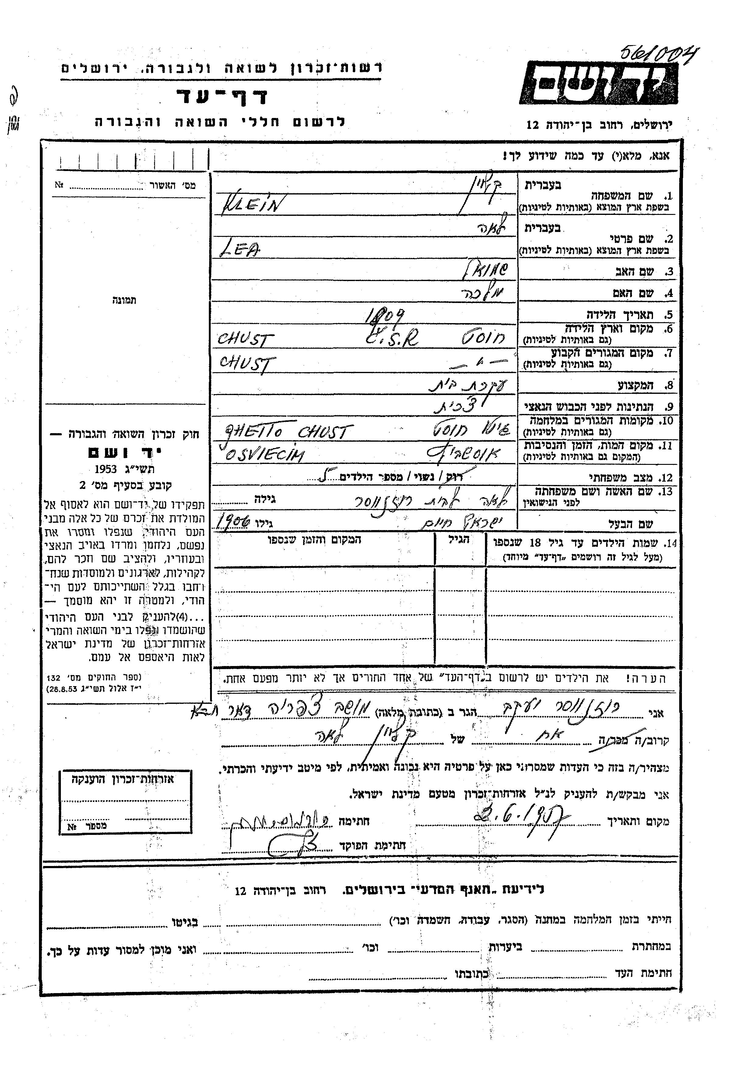 Klein Lea 1909 Chust, Tchécoslovaquie Feuille de témoignage