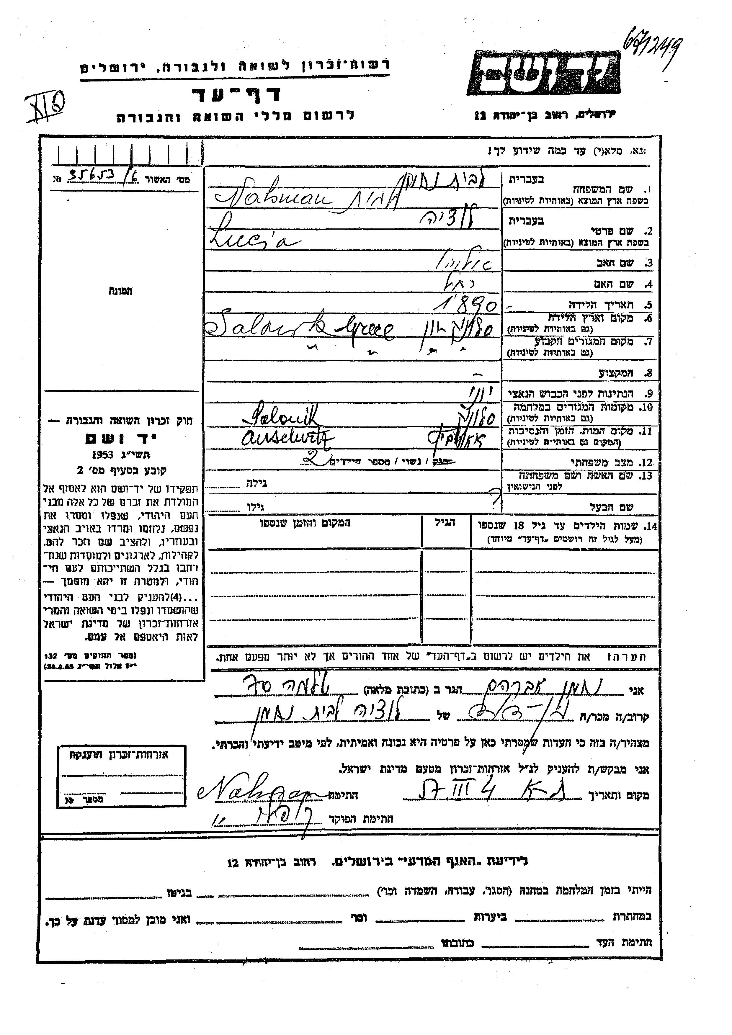 Nahman Lucia 1890 Thessaloniki, Grèce Feuille de témoignage