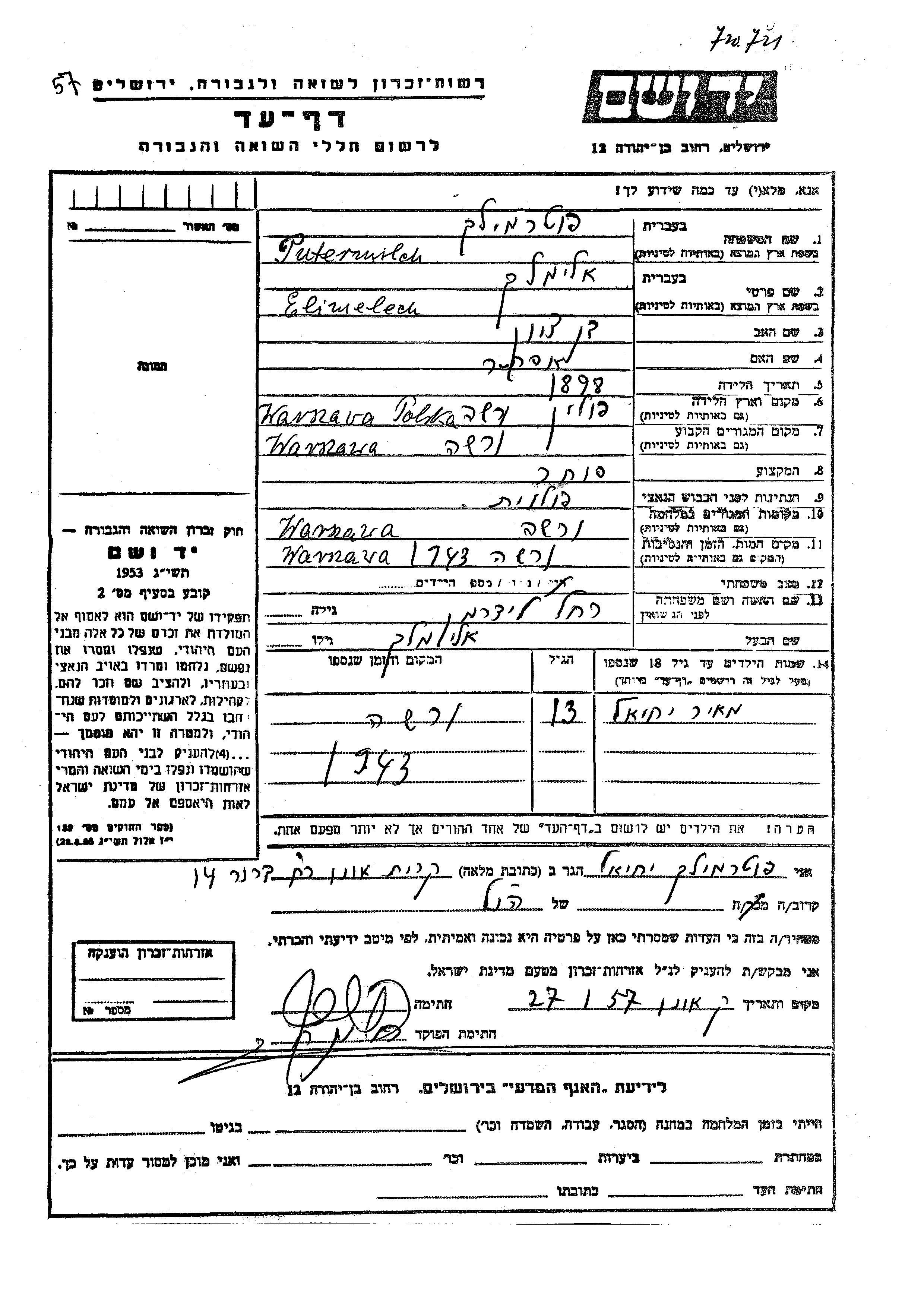 Elimelech a été assassiné pendant la Shoah. Lieu de la mort: Warszawa, Pologne en 1943.