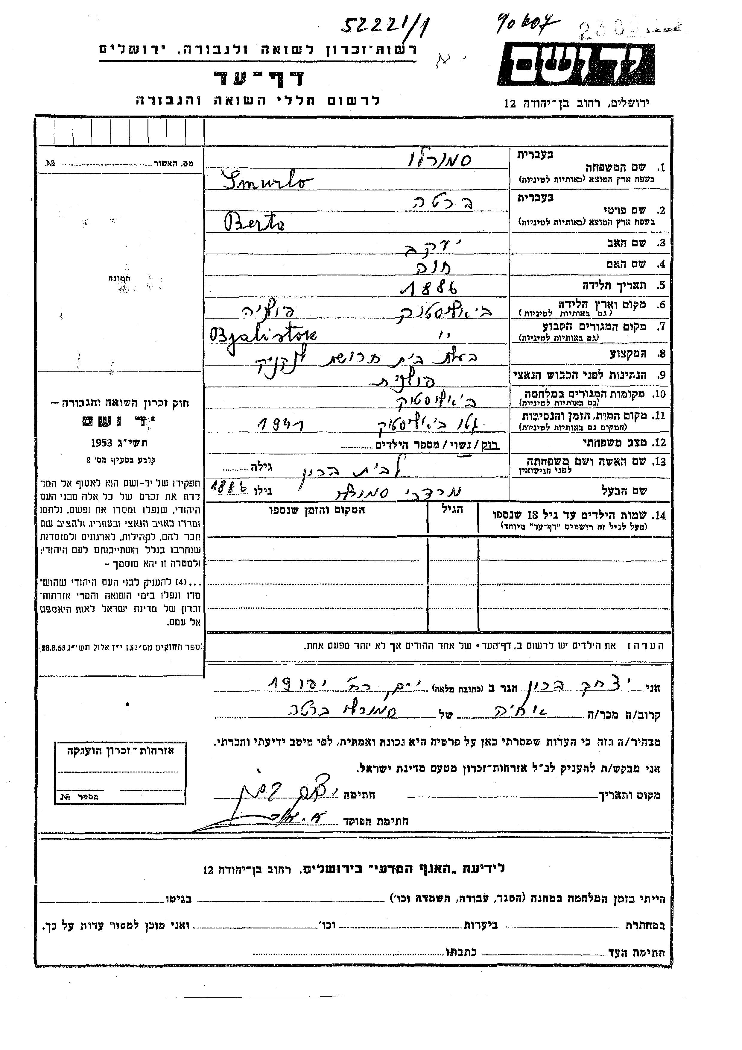 Smurlo Berta 1886 Bialystok, Pologne Feuille de témoignage