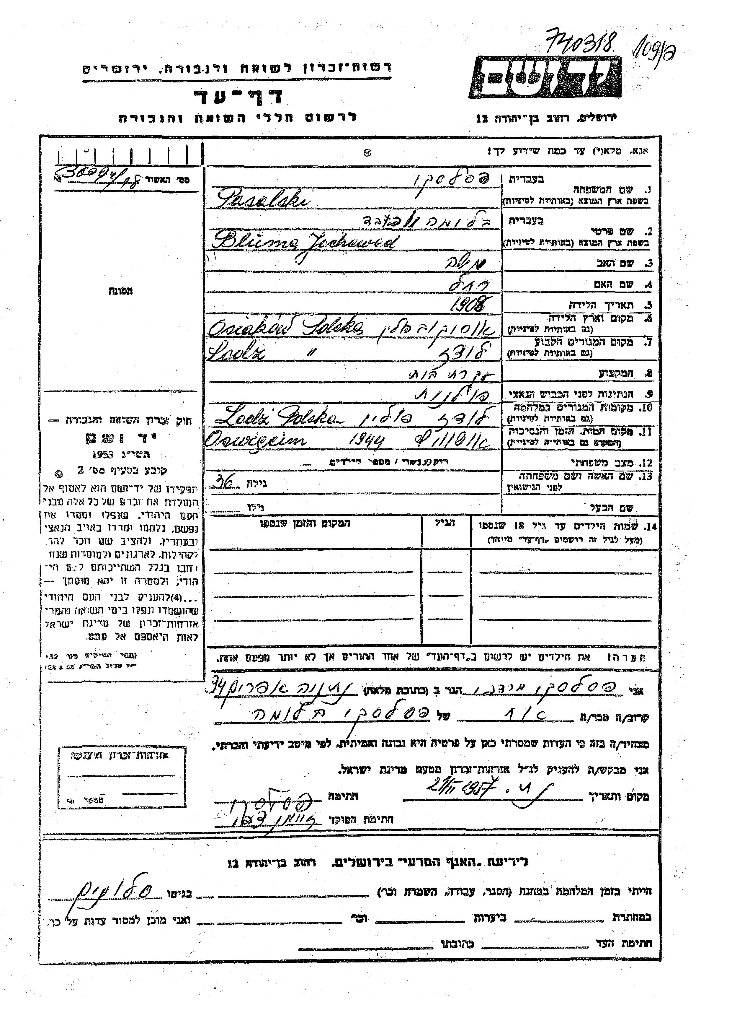 Pasalski Jochewed Bluma 1908 Lodz, Pologne Feuille de témoignage