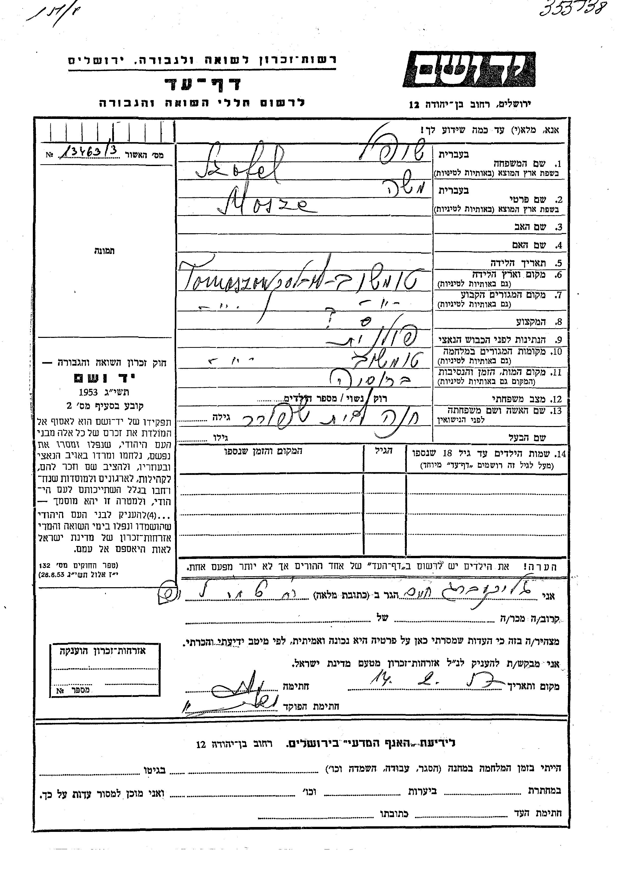 Szofel Mosze Tomaszow, Pologne Feuille de témoignage
