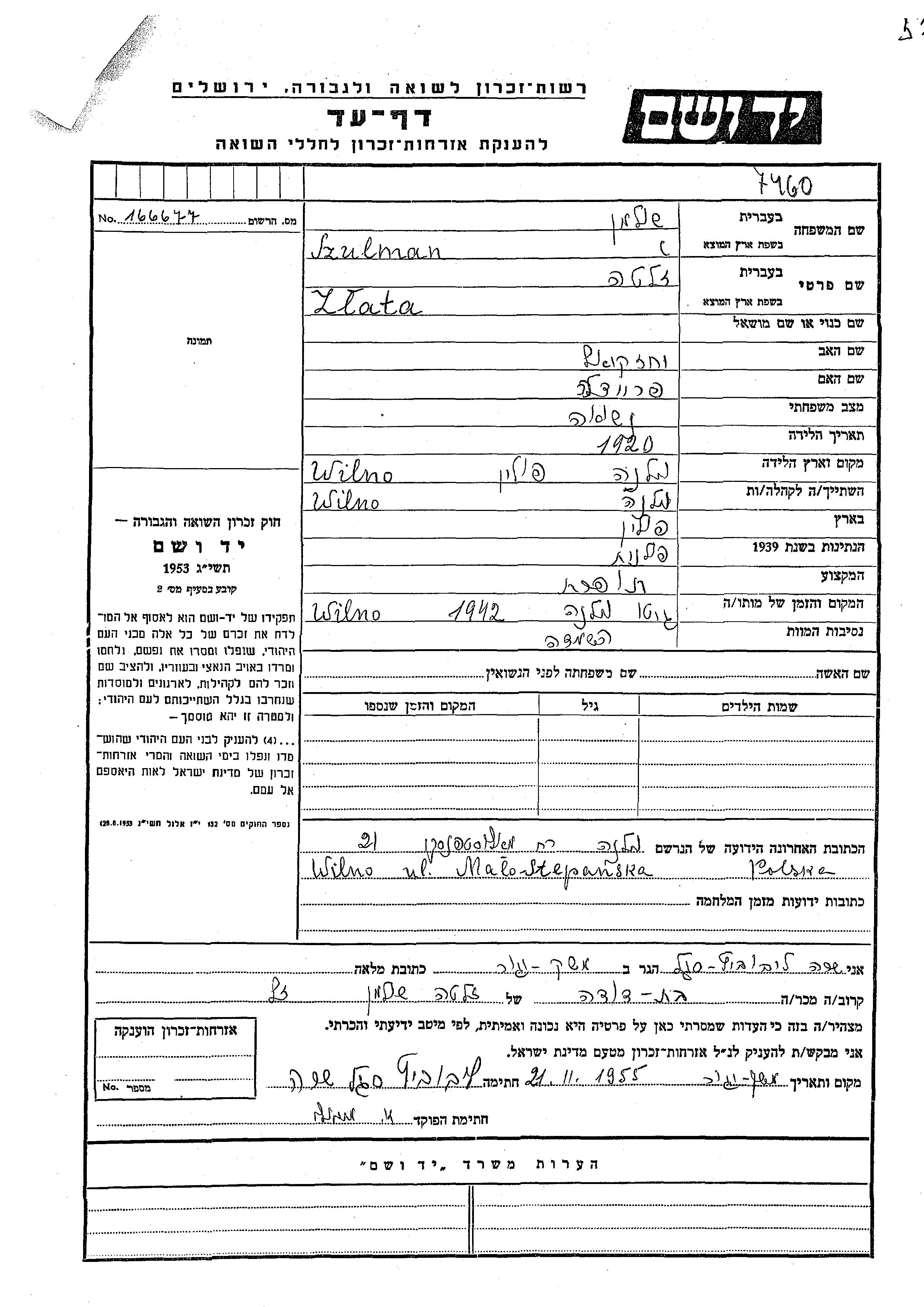 Szulman Zlata 1920 Wilno, Pologne Feuille de témoignage