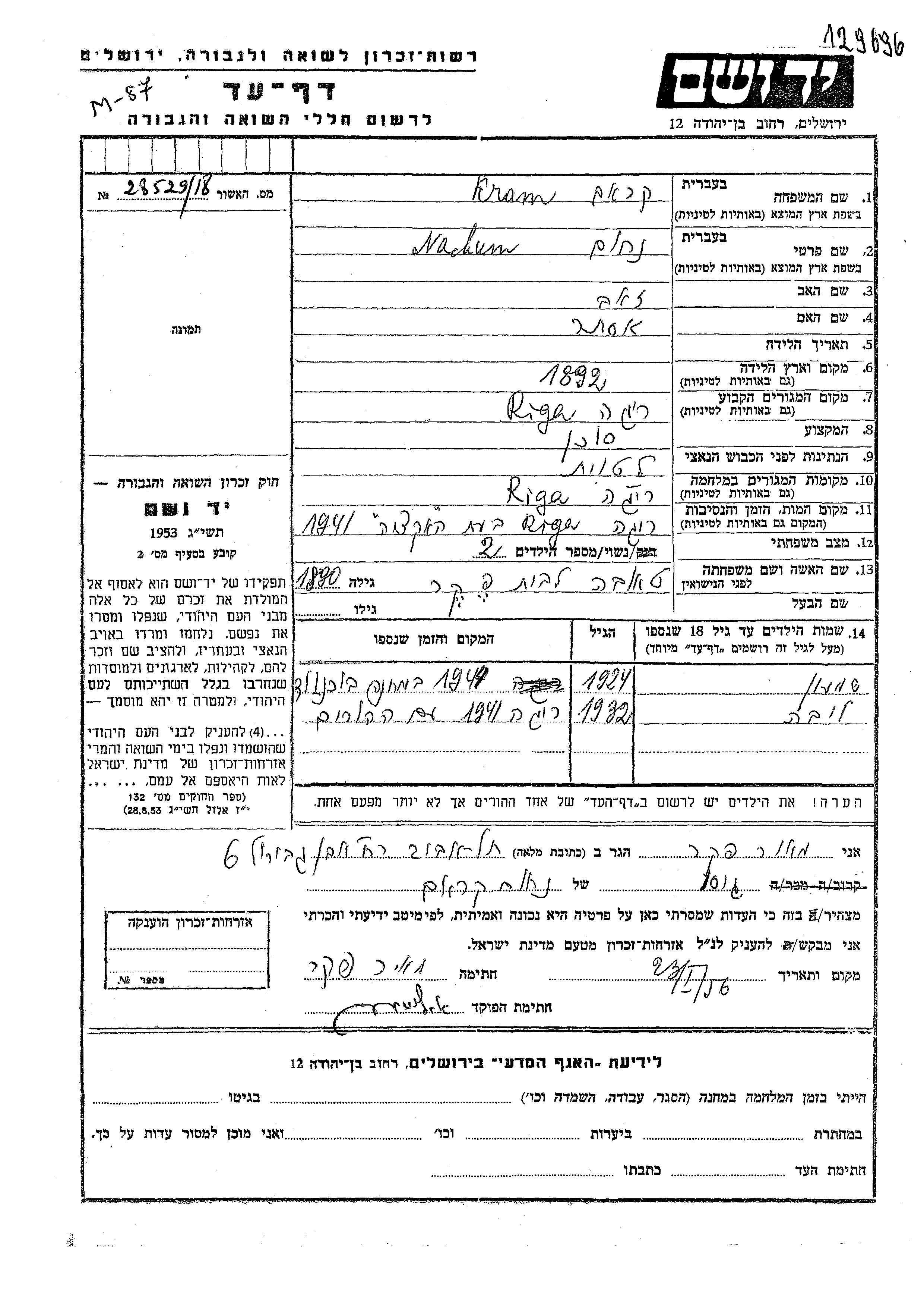 Kram Nachum 1892 Riga, Lettonie Feuille de témoignage