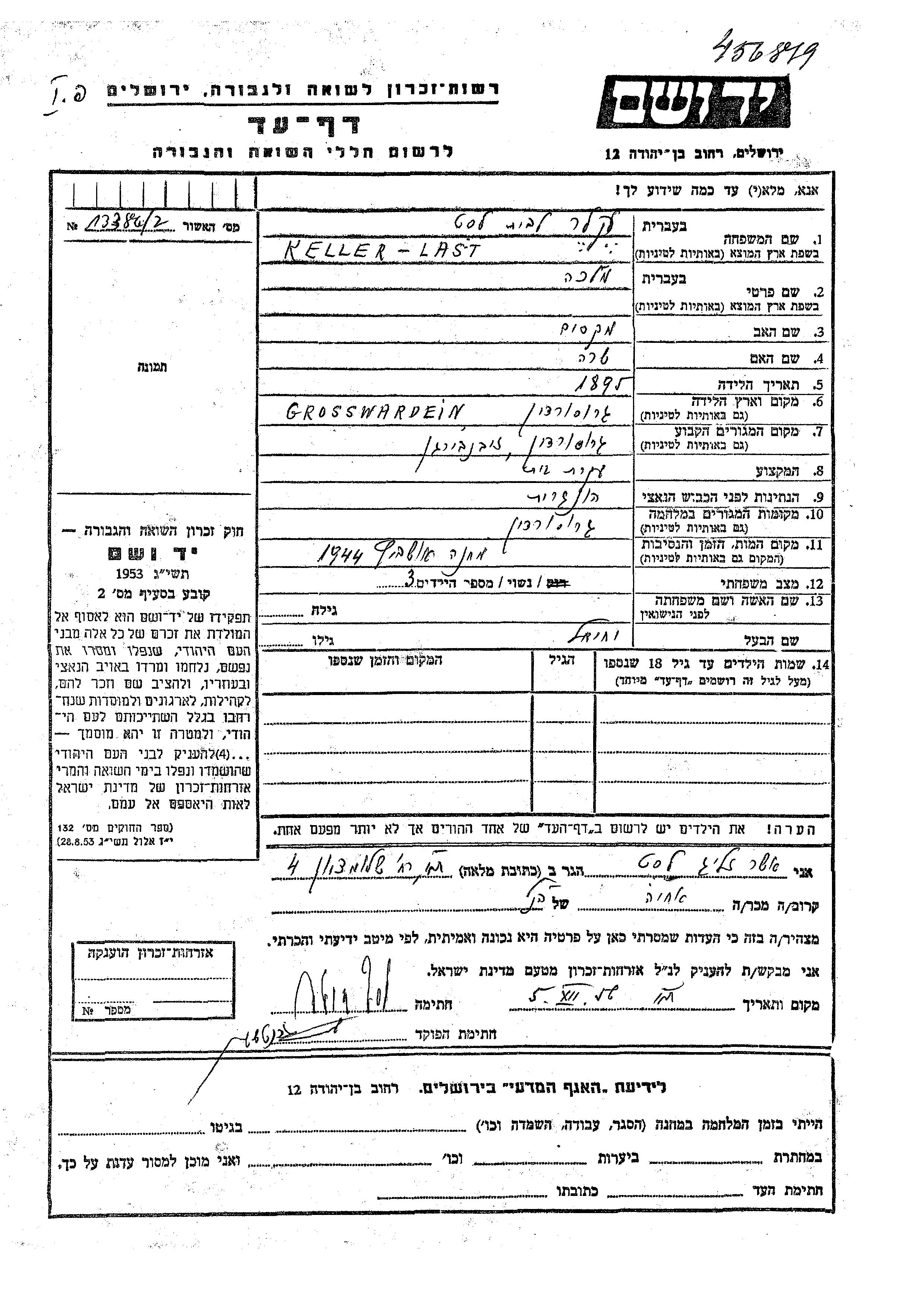 Malka Keller née Last est née à Grosswardein, Roumanie en 1895, fille de Maksimilian et de Sara. Elle était Femme au foyer et Mariée à Yekhiel. Avant la seconde guerre mondiale elle vivait à Grosswardein, Roumanie. Pendant la guerre, elle était à Grosswardein, Roumanie.