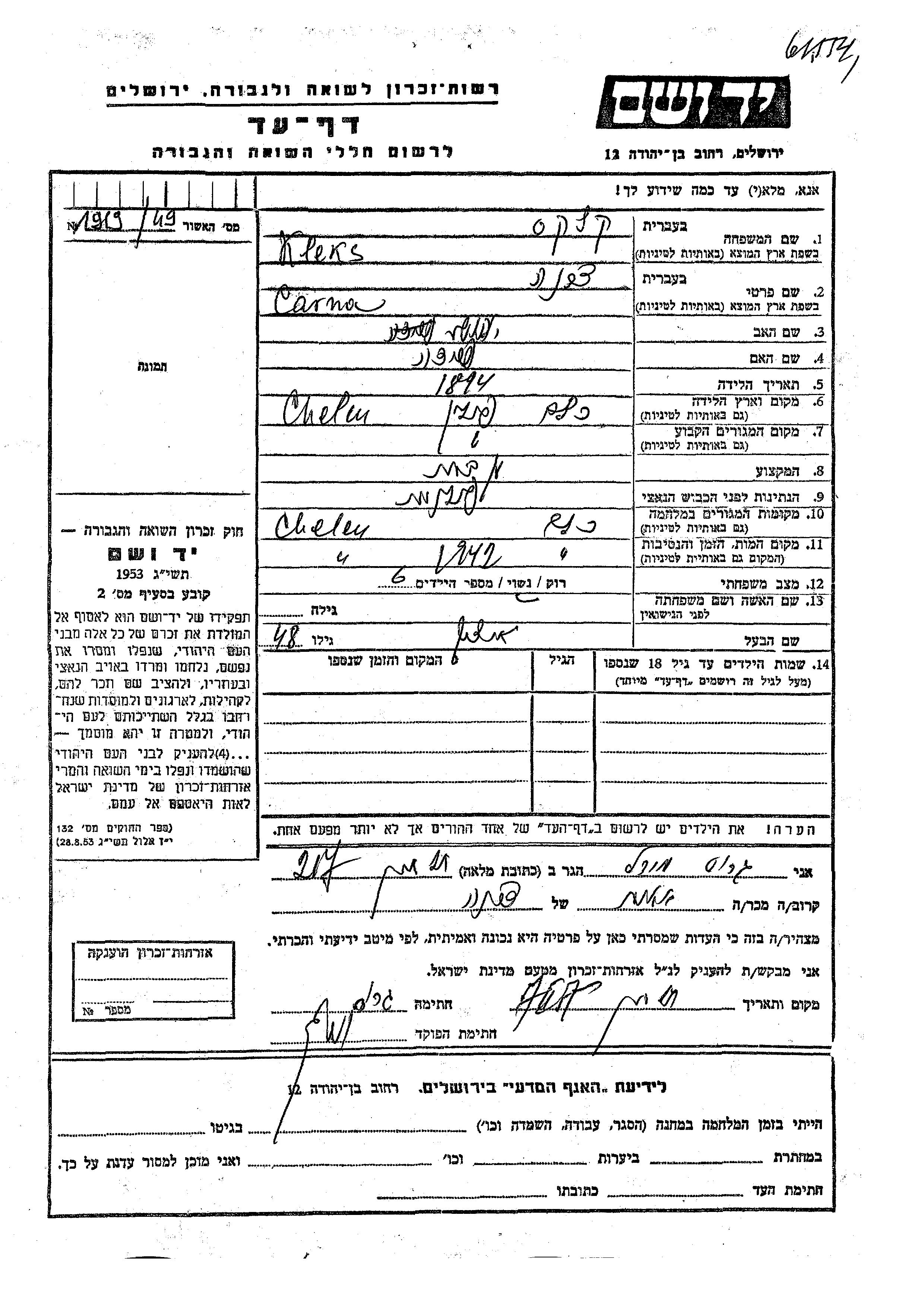 Carna Kleks est née à Chelm, Pologne en 1894, fille de Yehoshua et de Frida. Elle était Femme au foyer et Mariée à Itzik. Avant la seconde guerre mondiale elle vivait à Chelm, Pologne. Pendant la guerre, elle était à Chelm, Pologne.