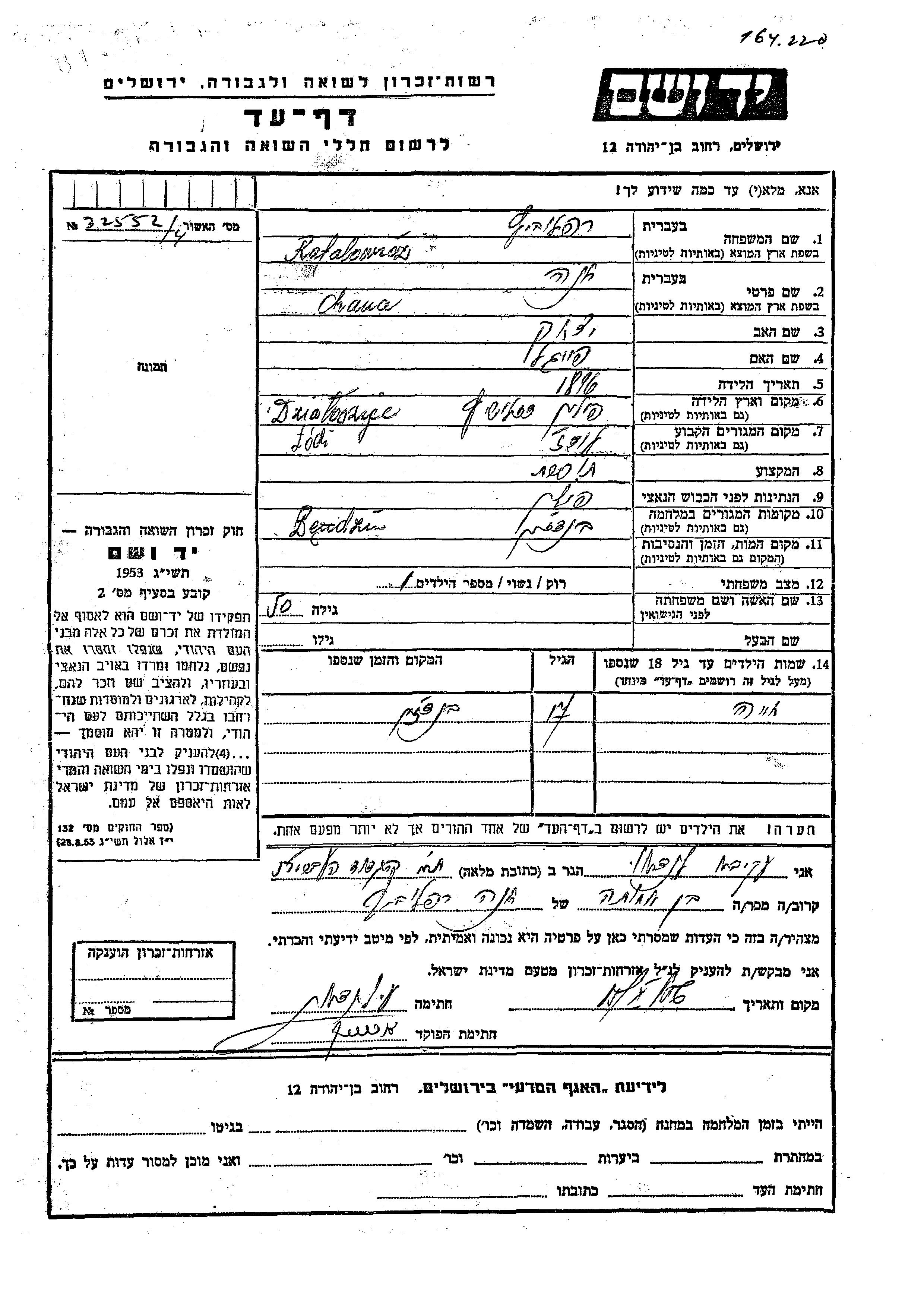 Rafalowicz Chana 1896 Lodz, Pologne Feuille de témoignage
