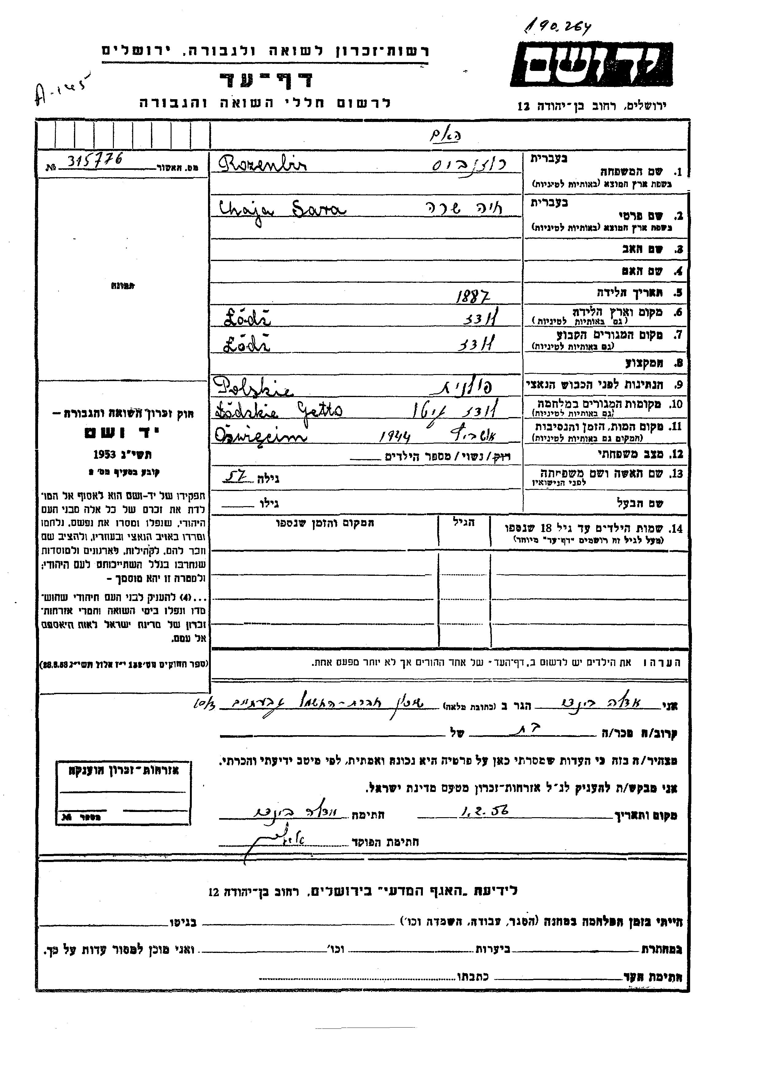 Rozenbis Chaja Sara 1887 Lodz, Pologne Feuille de témoignage