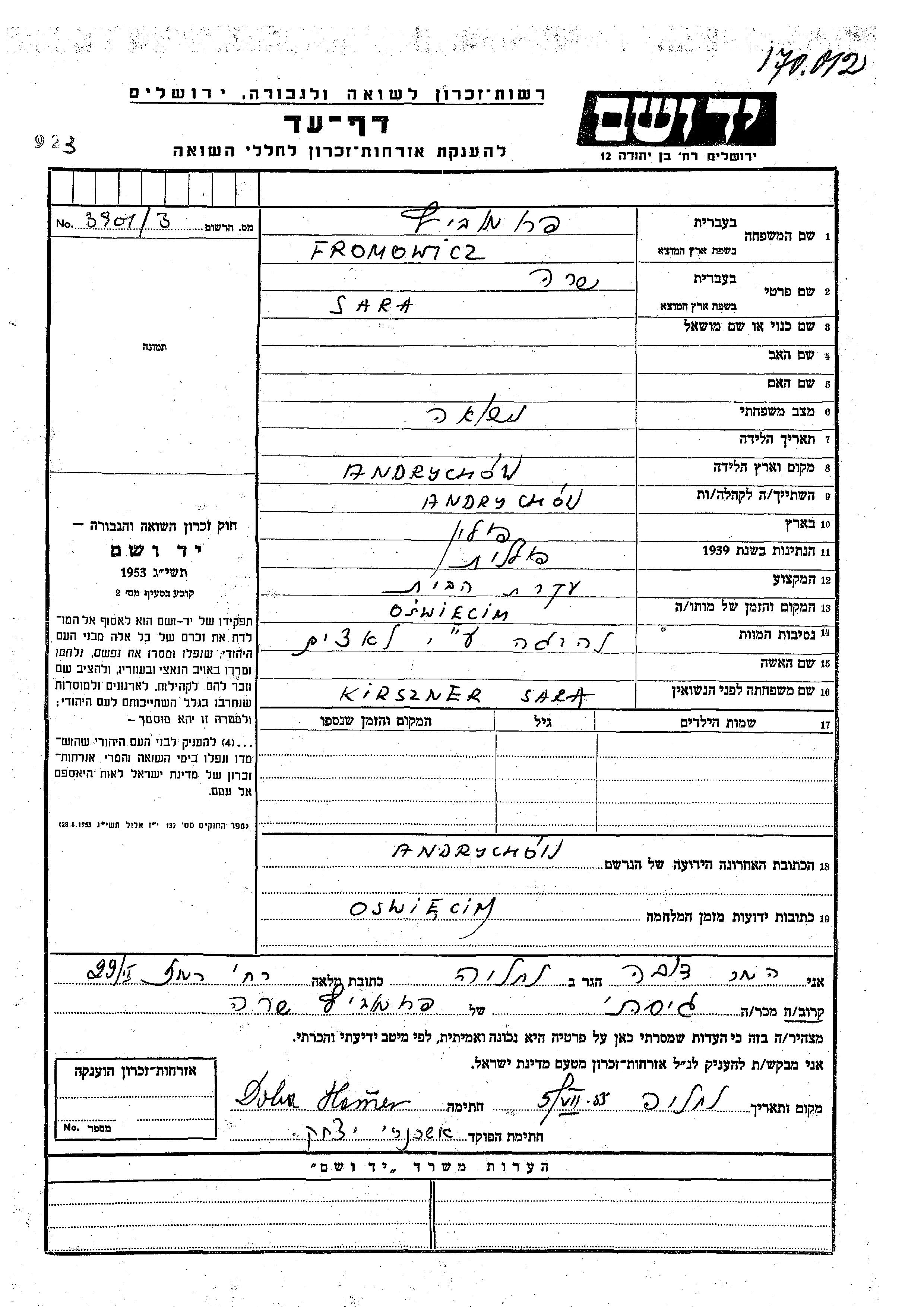 Sara Fromowicz née Kirszner est née à Andrychów, Pologne. Elle était Femme au foyer. Avant la seconde guerre mondiale elle vivait à Andrychów, Pologne. Pendant la guerre, elle était à Auschwitz, Pologne.