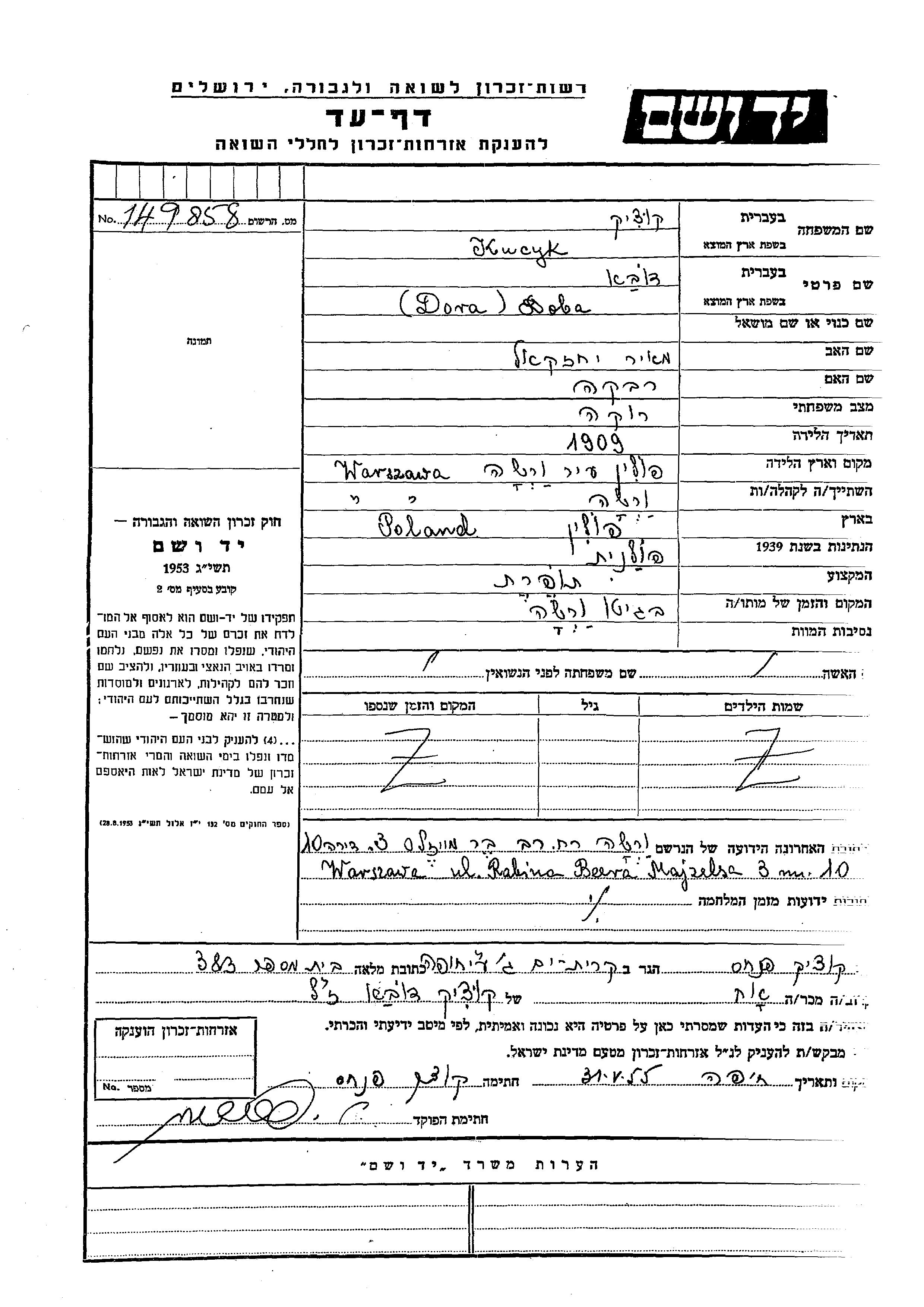Doba Kucyk est née à Varsha, Pologne en 1909, fille de Meir Yekhezkel et de Rivka. Elle était Couturière et Célibataire. Avant la seconde guerre mondiale elle vivait à Varsha, Pologne. Pendant la guerre, elle était à Varsha, Pologne.