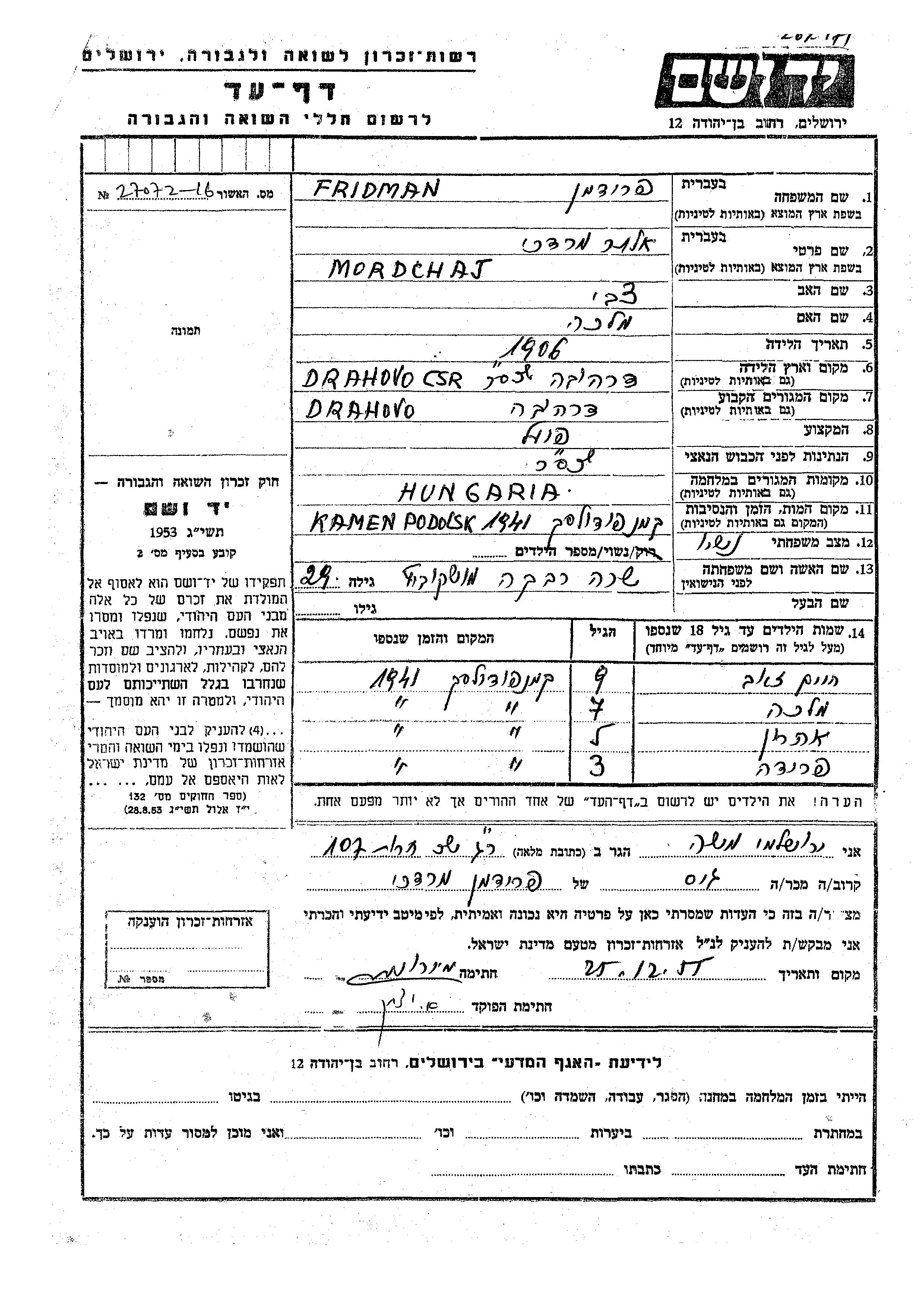 Fridman Mordchaj Alter 1906 Drahovo, Tchécoslovaquie Feuille de témoignage