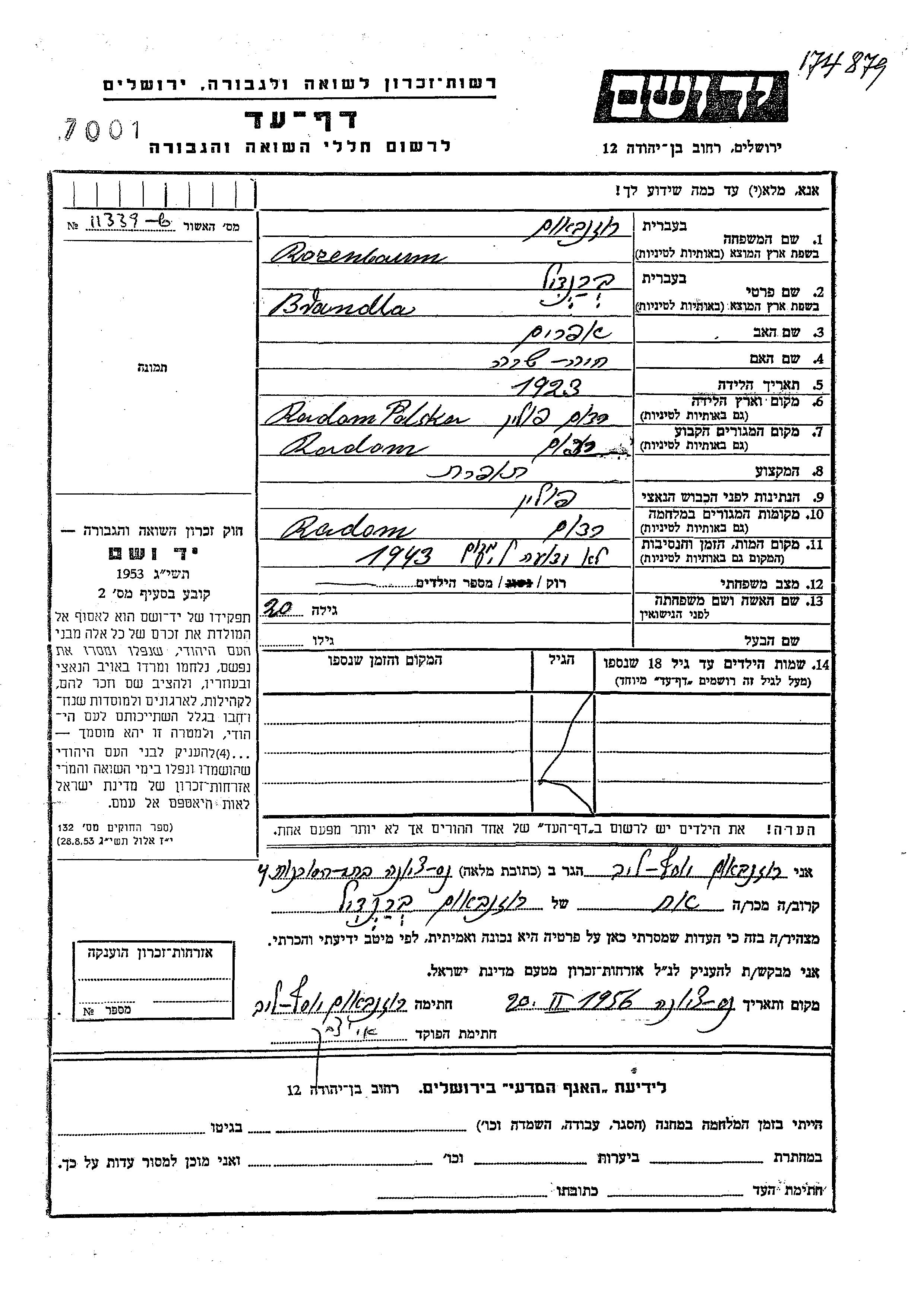 Brandla Rozenbaum est née à Radom, Pologne en 1923, fille de Efraim et de Khaia Sara. Elle était Couturière et Célibataire. Avant la seconde guerre mondiale elle vivait à Radom, Pologne. Pendant la guerre, elle était à Radom, Pologne.