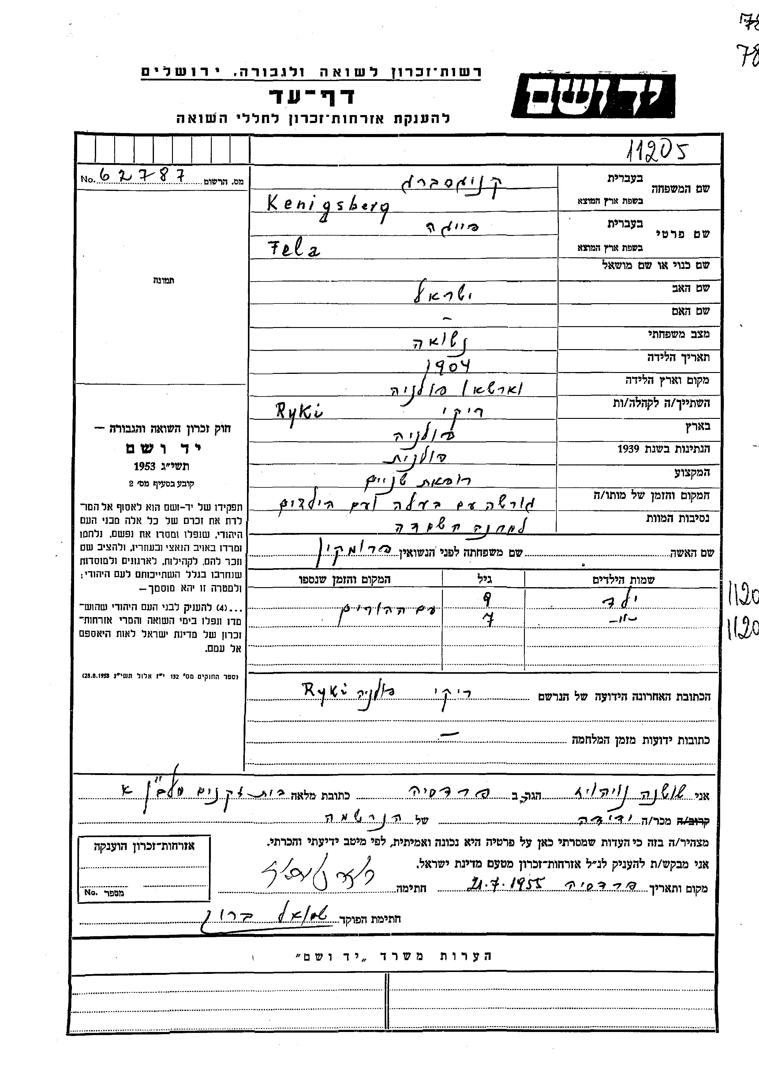 Fela Feiga Kenigsberg née Frumkin est née à Warszawa, Pologne en 1904, fille de Yisrael. Elle était Dentiste et Mariée. Avant la seconde guerre mondiale elle vivait à Ryki, Pologne. Pendant la guerre, elle était à Ryki, Pologne.