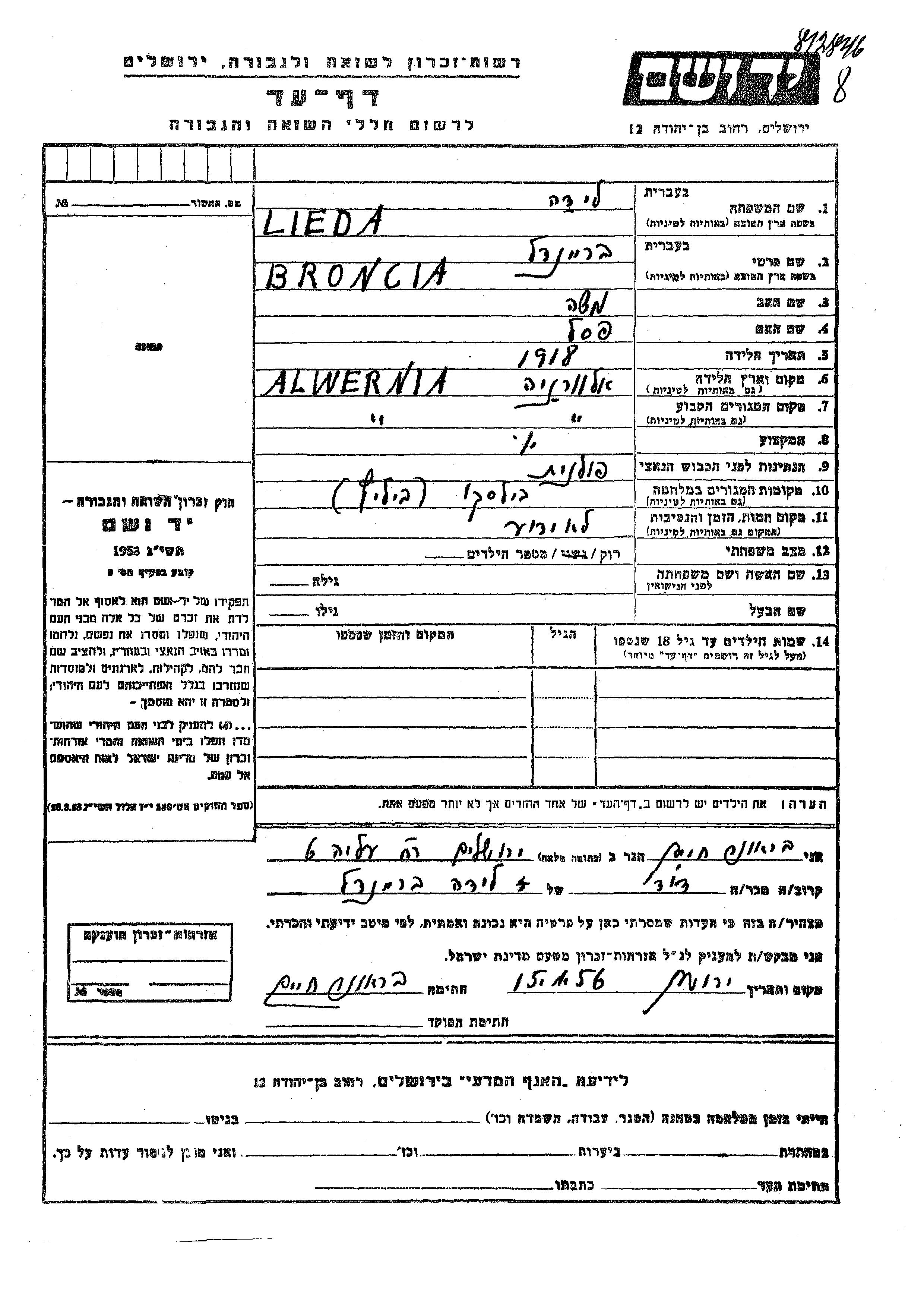 Lieda Lida Broncia Braindel 1918 Alwernia, Pologne Feuille de témoignage