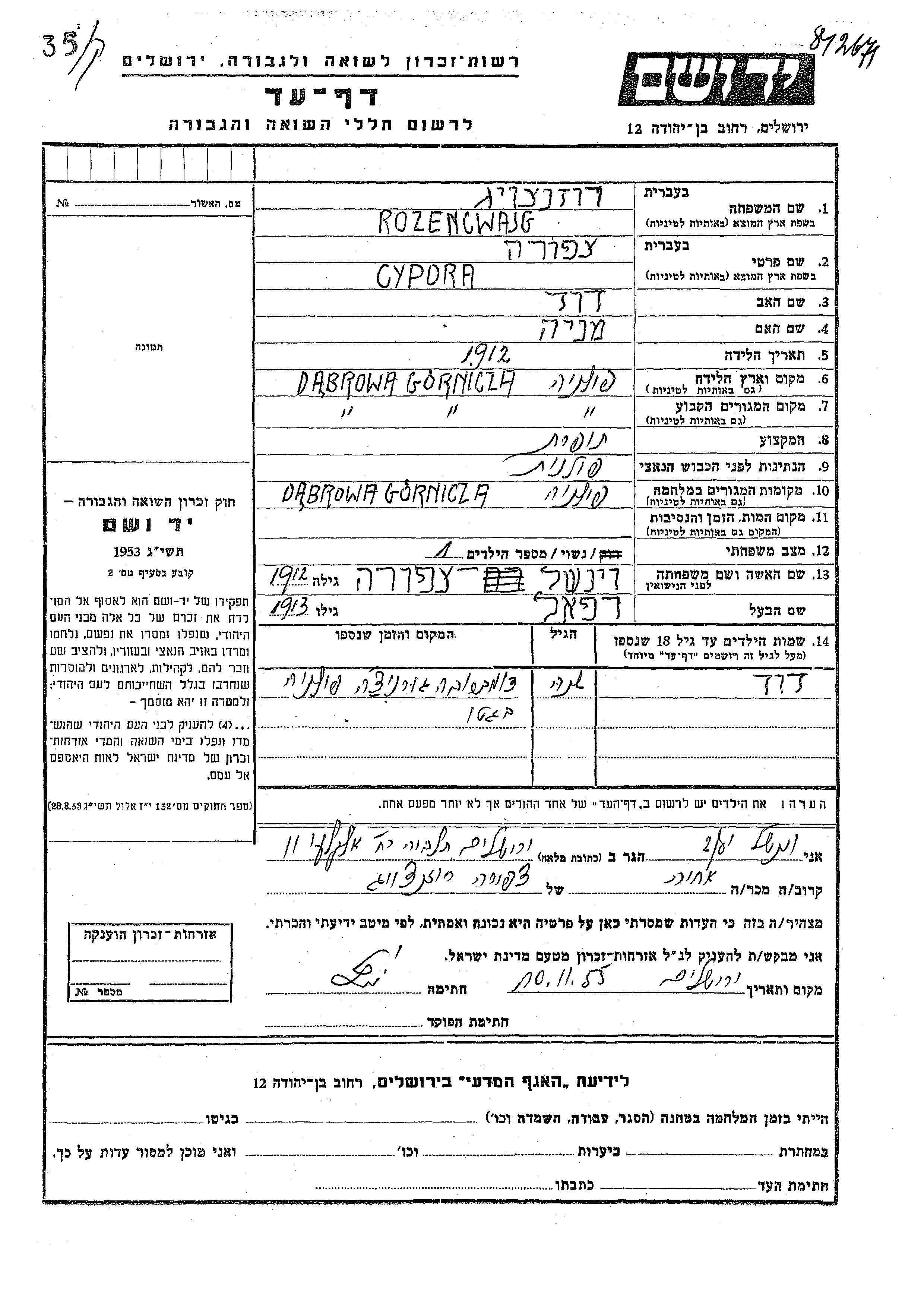 Rozencwajg Cypora 1912 Dabrowa Gornicza, Pologne Feuille de témoignage