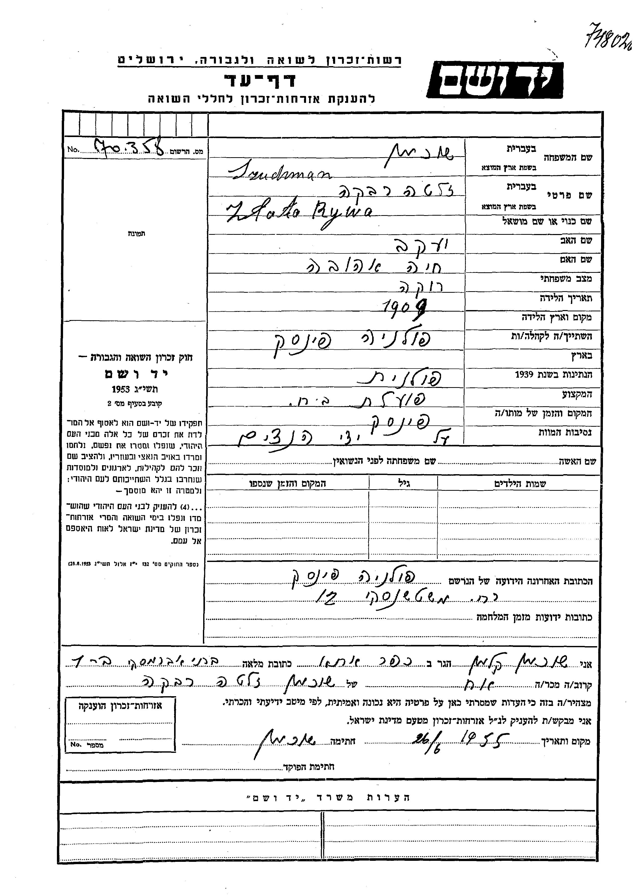 Szuchman Rywa Zlata 1909 Pinsk, Pologne Feuille de témoignage